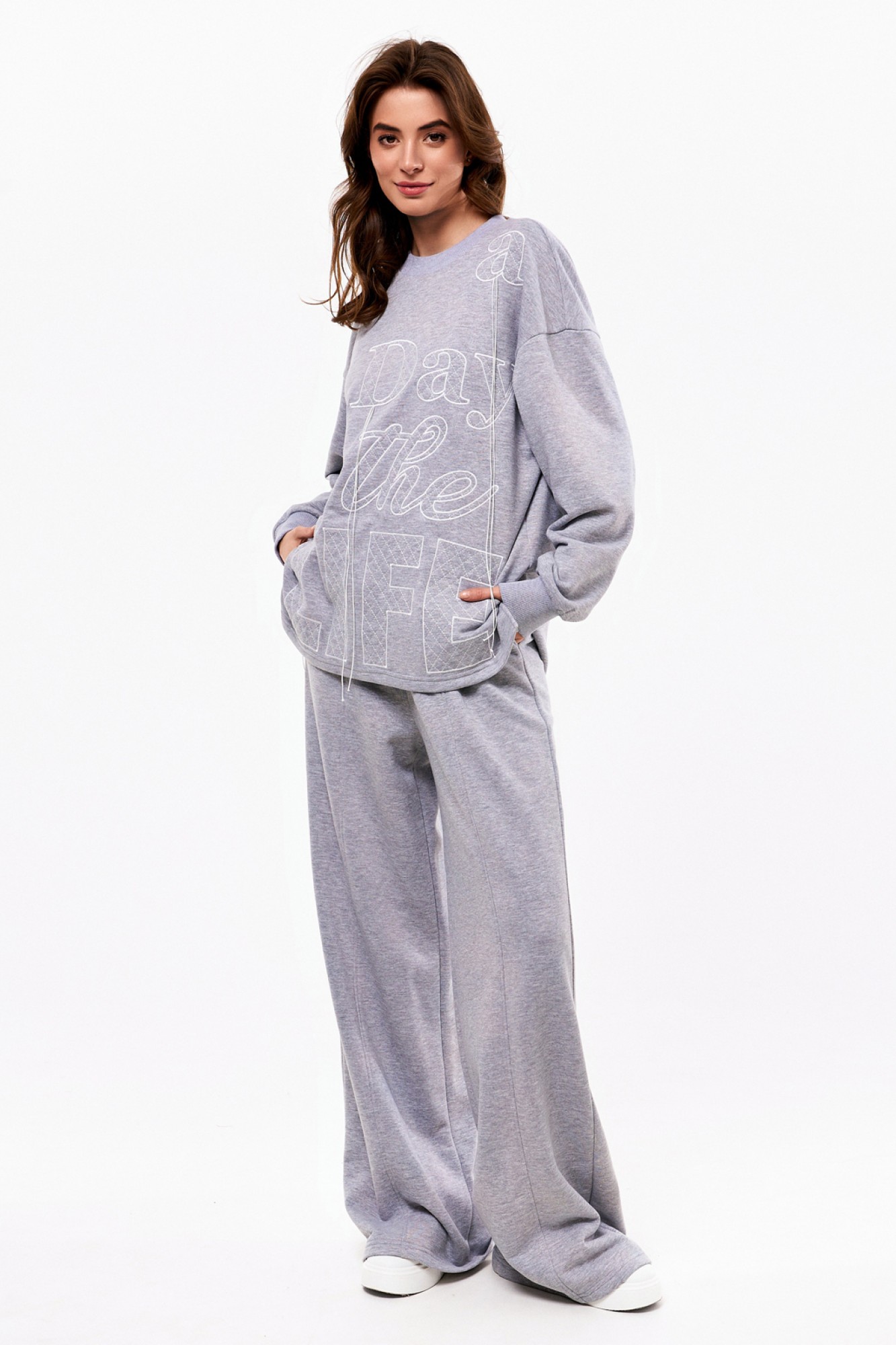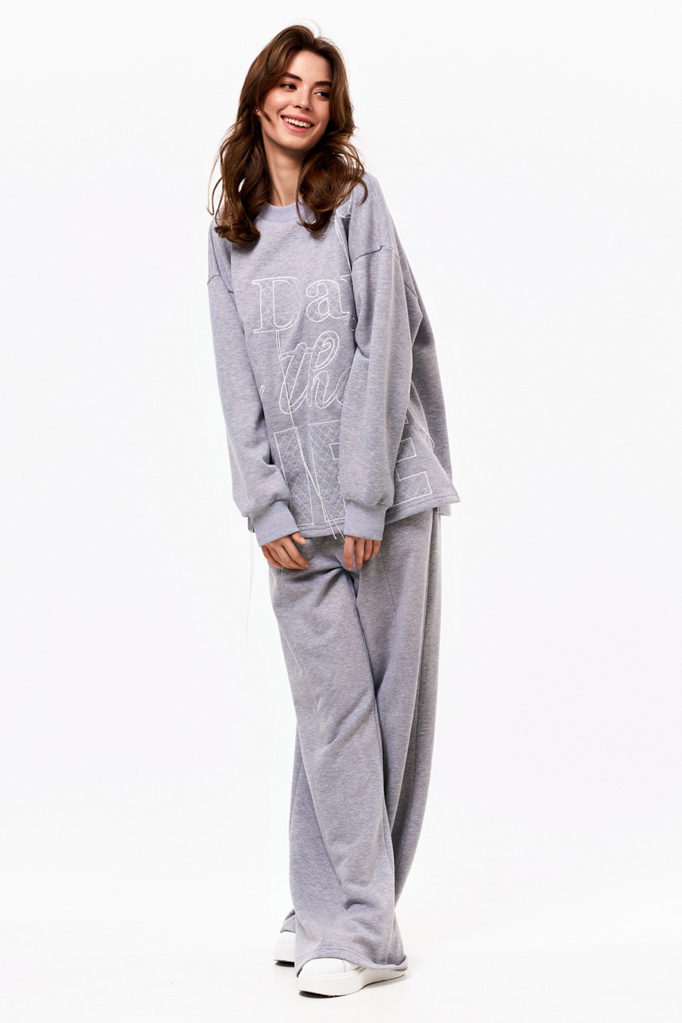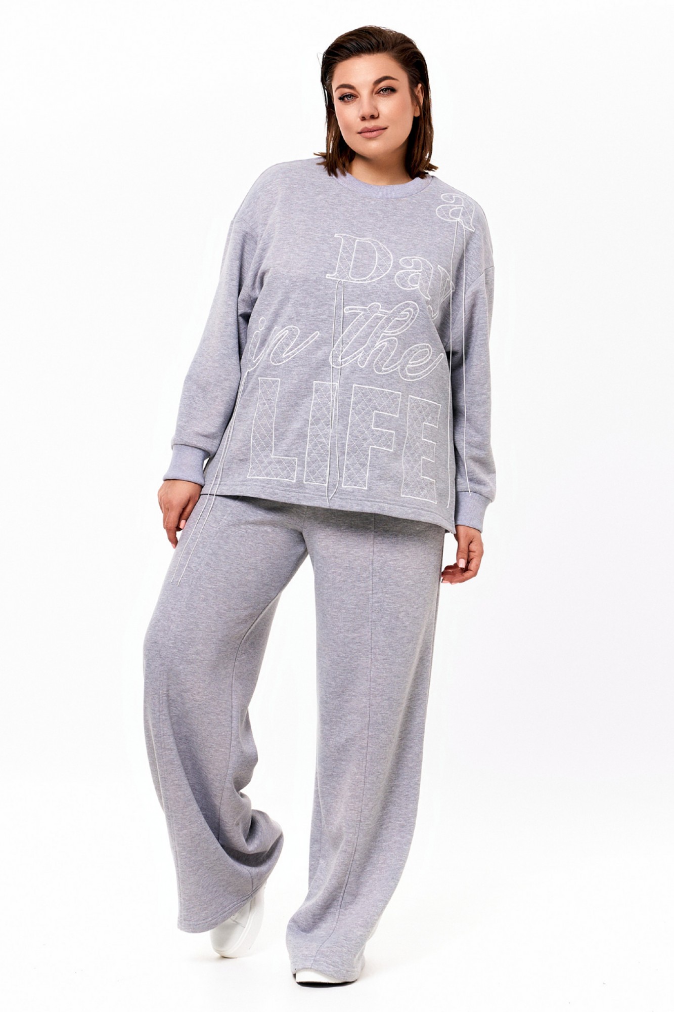 Объёмный джемпер из футера 3-х нитки с довязами на манжетах и по горловине. По переду контрастная вышивка. Брюки из футера 3-х нитки прямые от бедра. На резинке по талии и с контрастным шнуром. По переду отстроченные защипы.