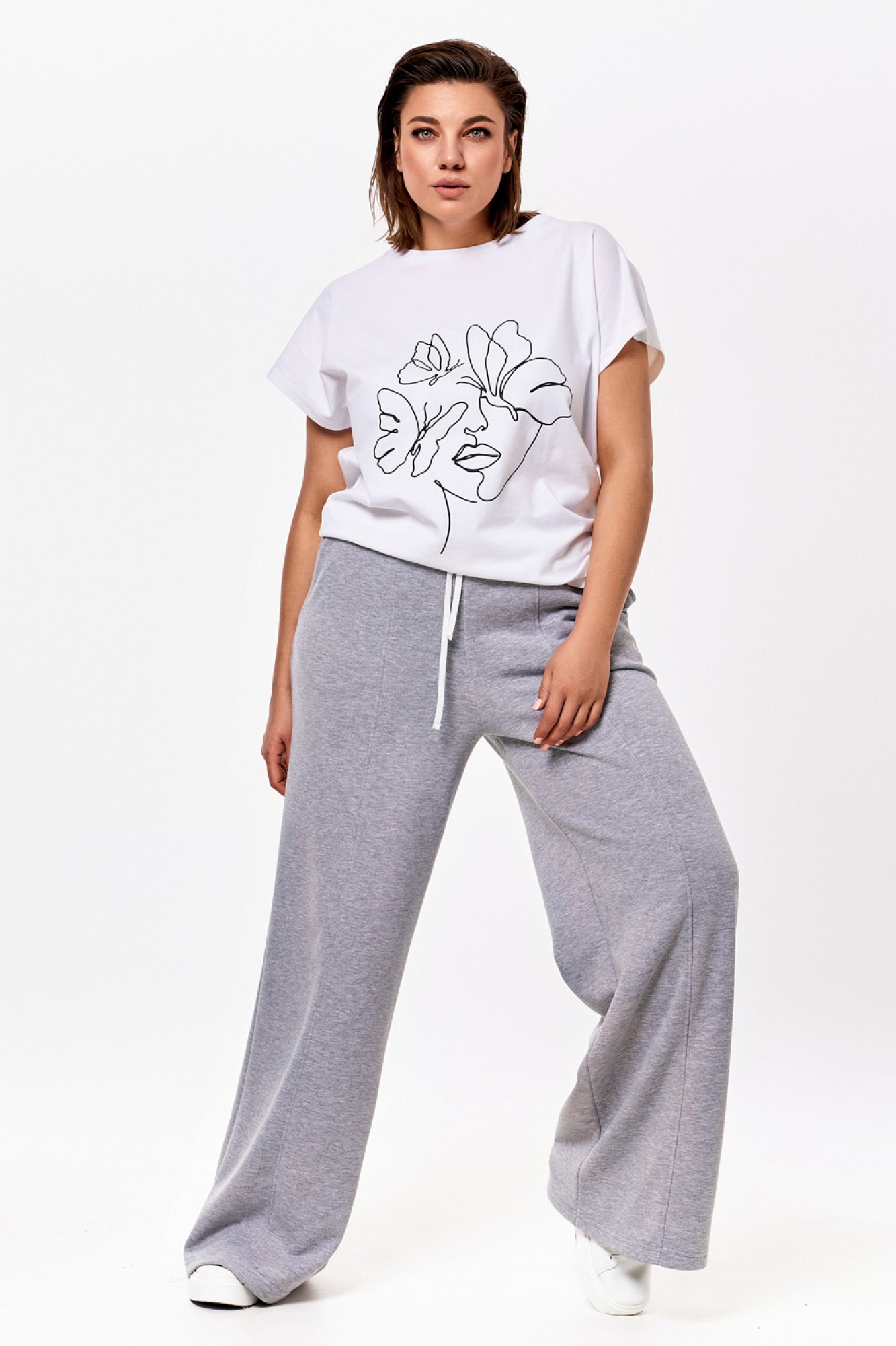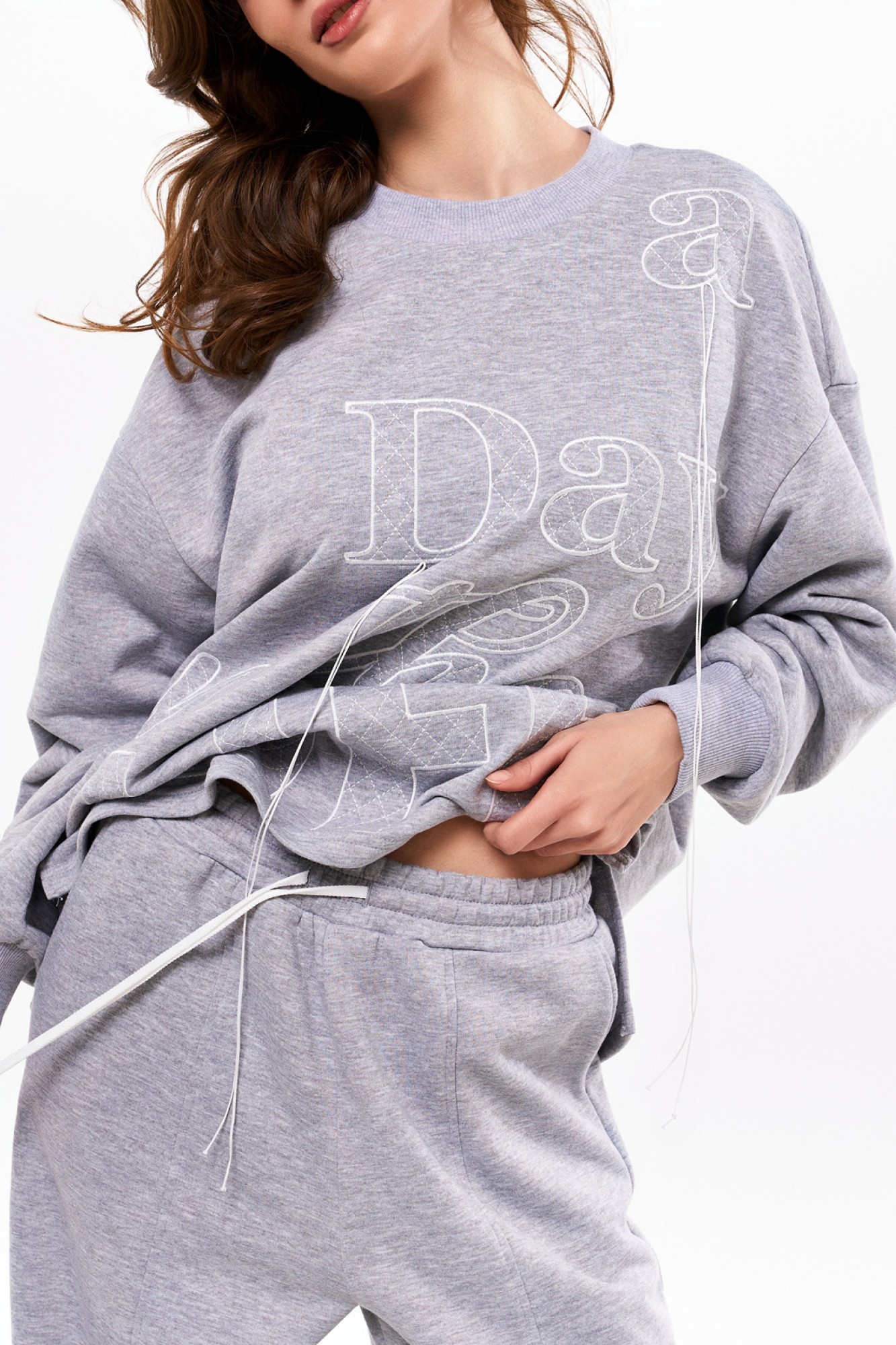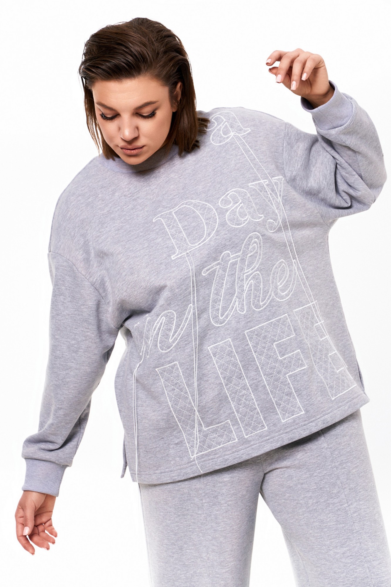 Объёмный джемпер из футера 3-х нитки с довязами на манжетах и по горловине. По переду контрастная вышивка. Брюки из футера 3-х нитки прямые от бедра. На резинке по талии и с контрастным шнуром. По переду отстроченные защипы.