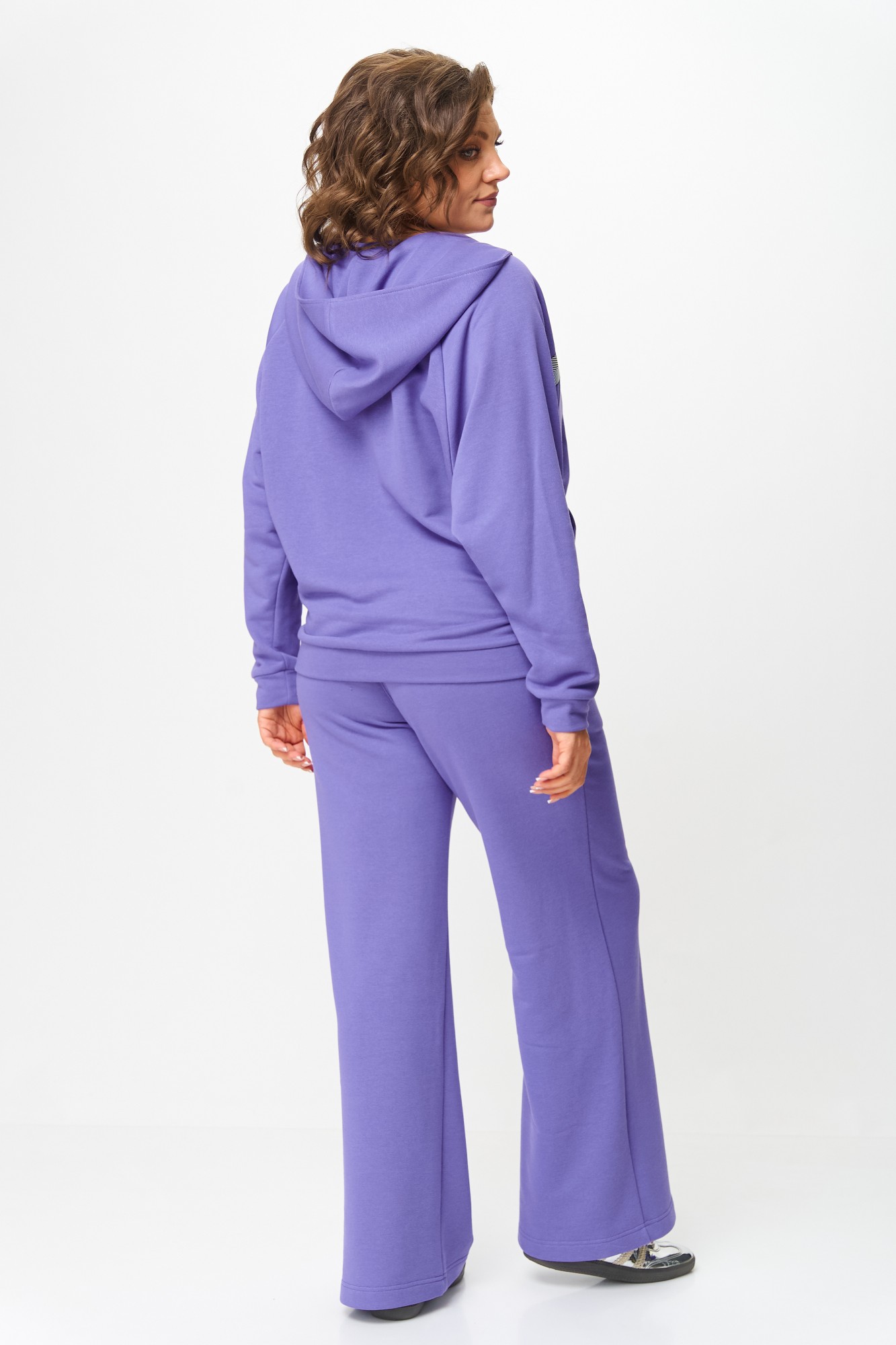 Брюки длиной с клеш-отделкой созданы для комфортной посадки: на притачном поясе с резинкой и двумя боковыми карманами. Длина по боковому шву — 111 см, пошаговая длина — 80 см, а длина худи по спинке составляет 64 см. Рукав от горловины — 72 см. Изделие подойдет на рост 170 см.