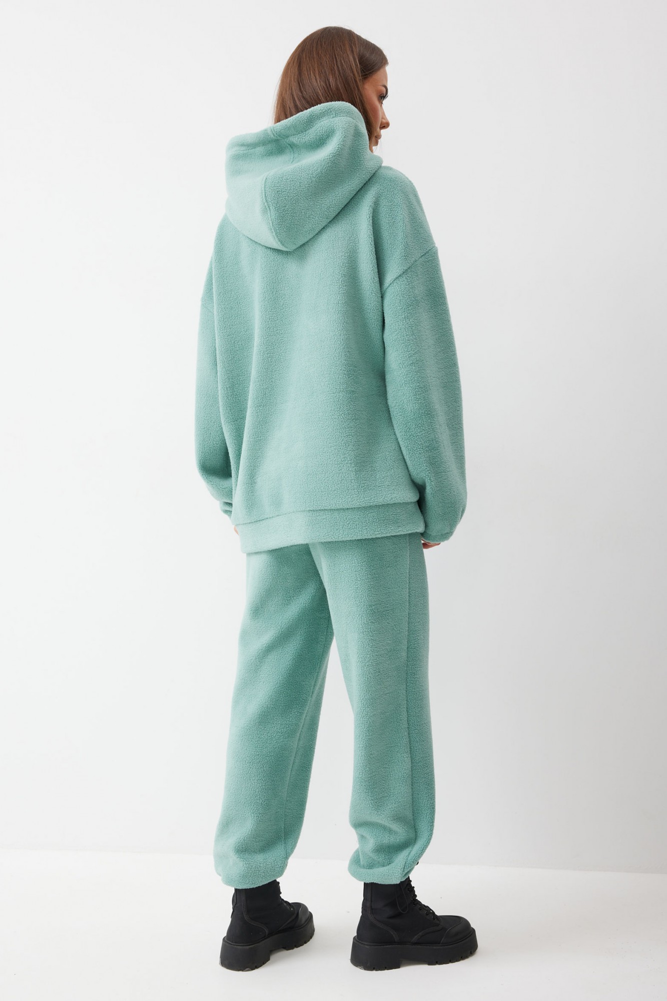 Костюм состоящий из джемпера и брюк. Джемпер прямого силуэта из комфортного трикотажного полотна. Горловина обработана капюшоном. Рукав со спущенной линией плеча, по низу на резинке. По низу джемпера притачной пояс. По переду декоративная нашивка и шнур. Брюки прямого силуэта из комфортного трикотажного полотна. По верху брюк притачной пояс на резинке. На передних половинках брюк обработаны карманы. Ширина брюк по низу регулируется за счет эластичной тесьмы и фиксаторов. Обращаем ваше внимание, что фурнитура может отличаться от фото.