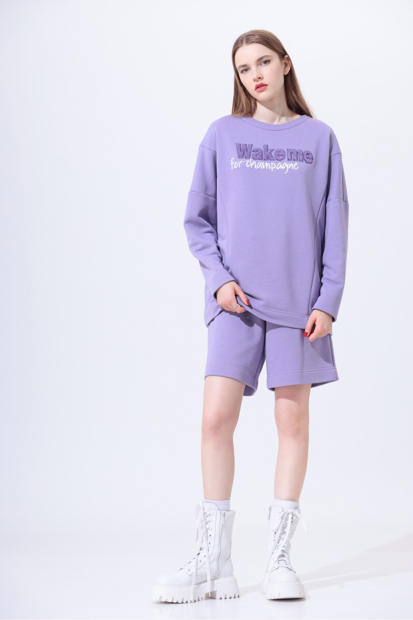 Свитшот с округлым вырезом горловины. Рукав длинный, со спущенной проймой. Длина свитшота ниже линии бедра. Перед и спинка с рельефами. На центральной части переда фактурная вышивка махровой нитью и шнуром. Горловина по спинке с обтачкой, по обтачке – отделочная строчка.