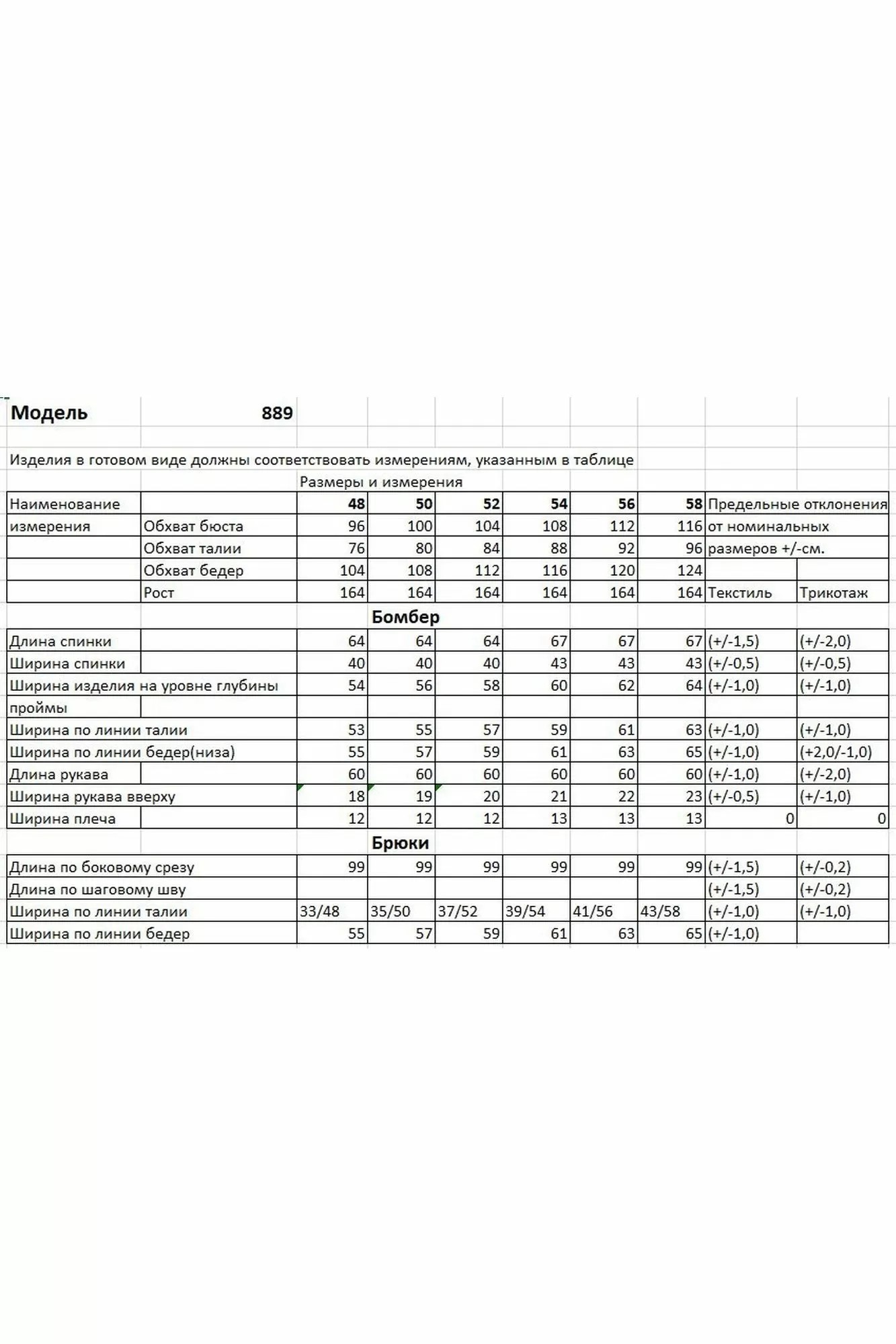 Таблица измерений