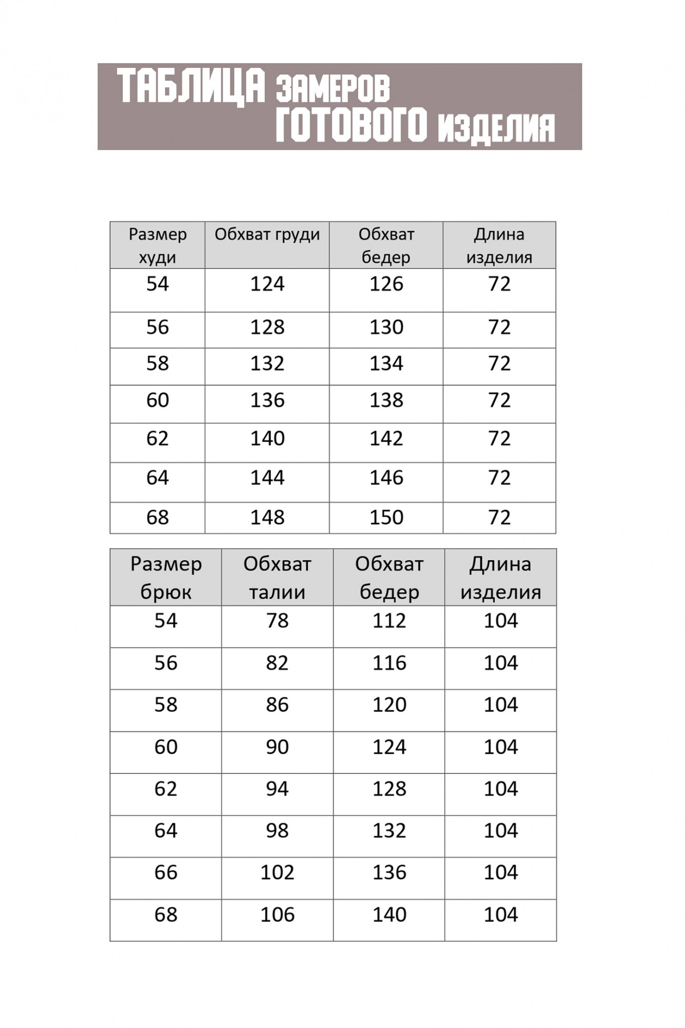 Таблица размеров