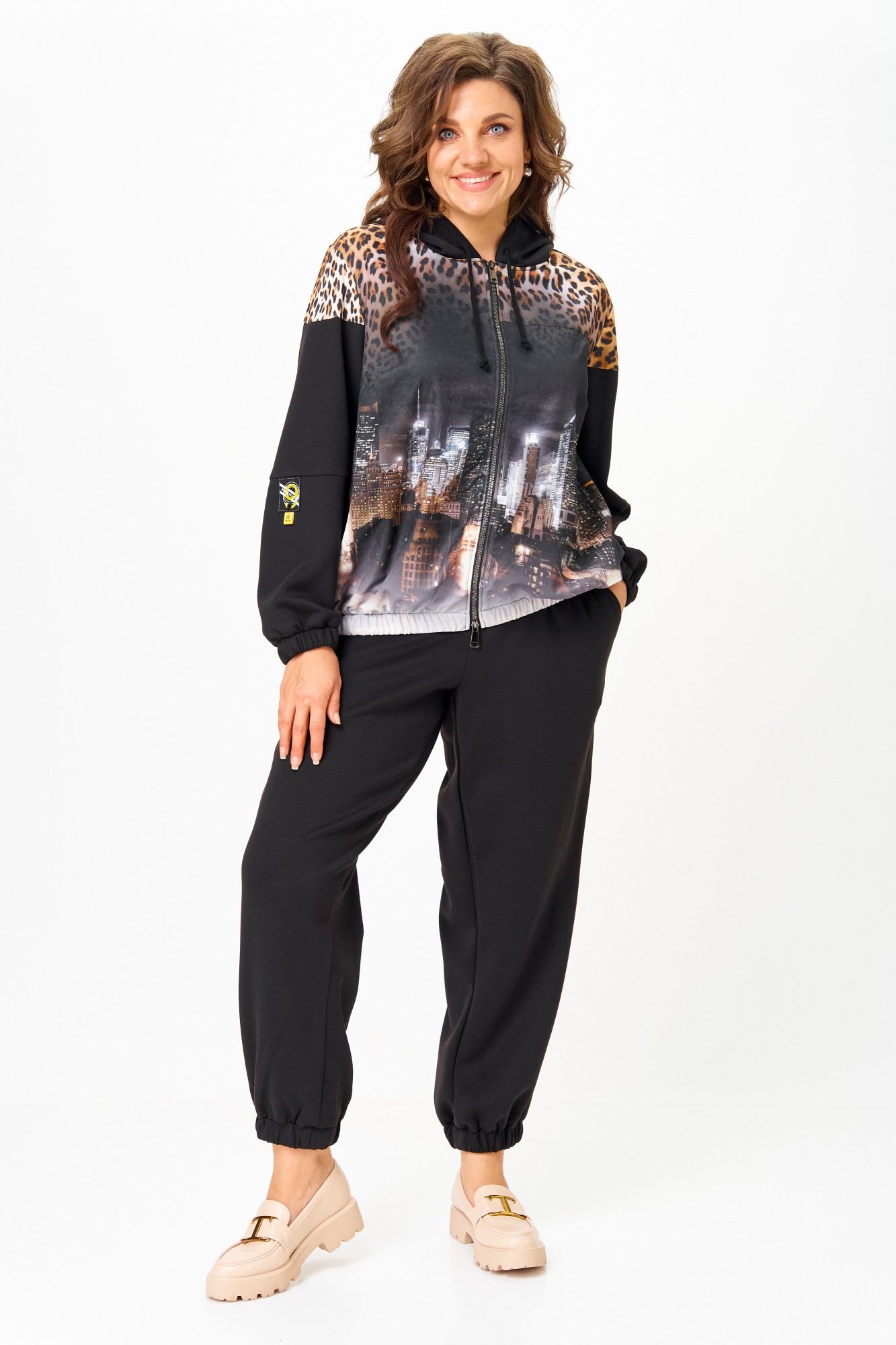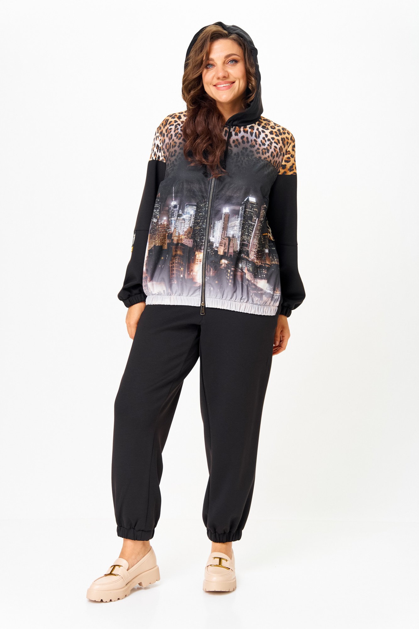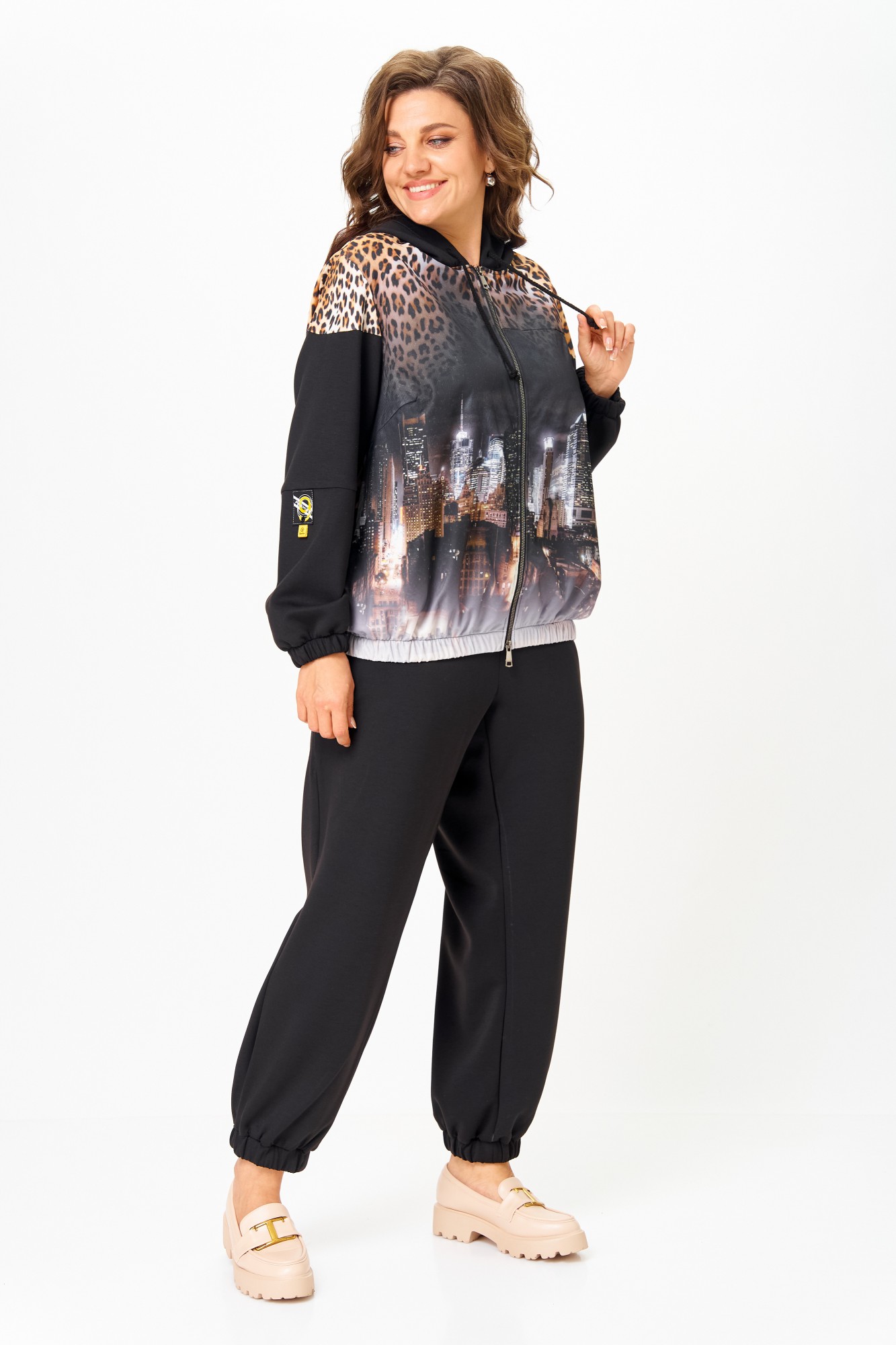 Костюм женский спортивный, состоящий из куртки и брюк. Костюм выполнен из 2-х видов ткани. Куртка с капюшоном свободного кроя на талии с прорезными карманами, застежка молния. Украшением куртки служит деталь из 3D сетки и нашивки на рукаве. Низ рукавов и низ куртки на эластичной манжете. Брюки заужены к низу, с карманами. Брюки на резинке по талии. Низ брюк на манжете с резинкой.