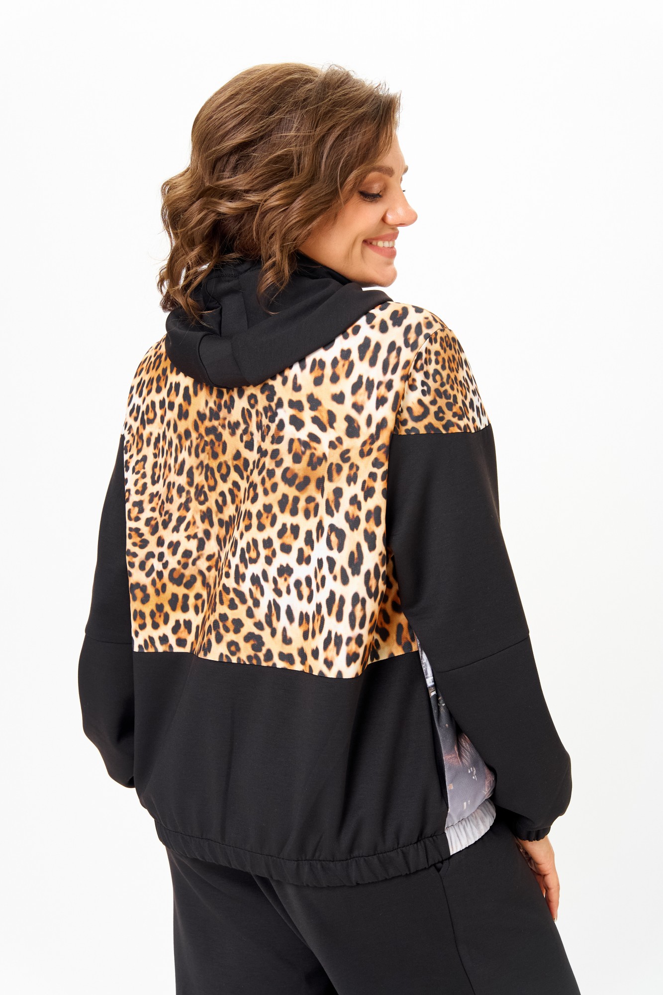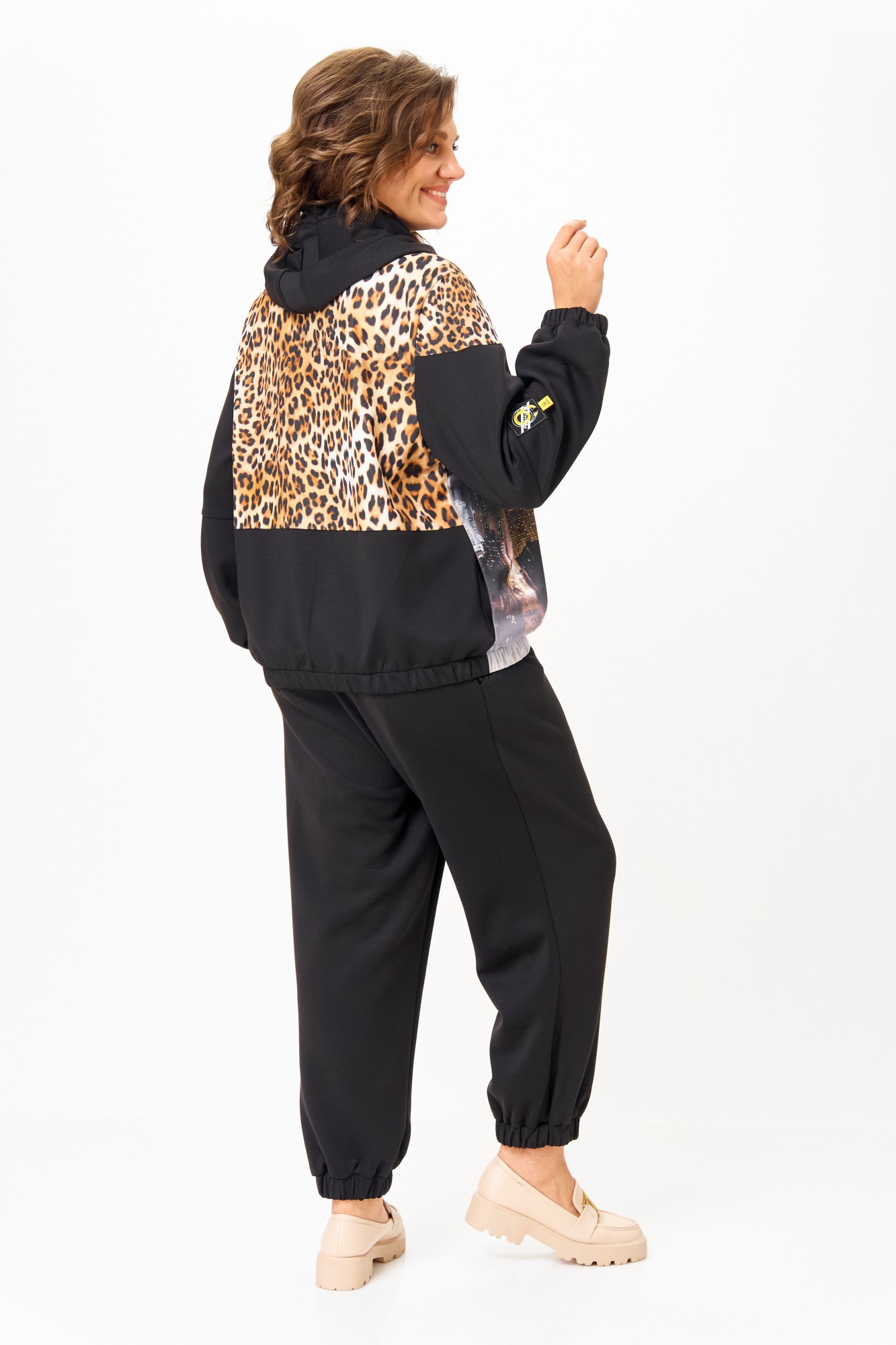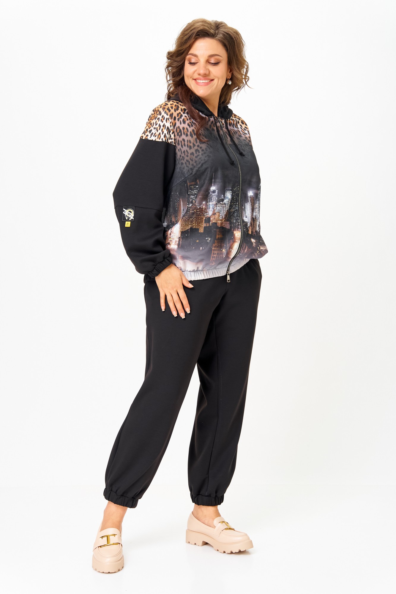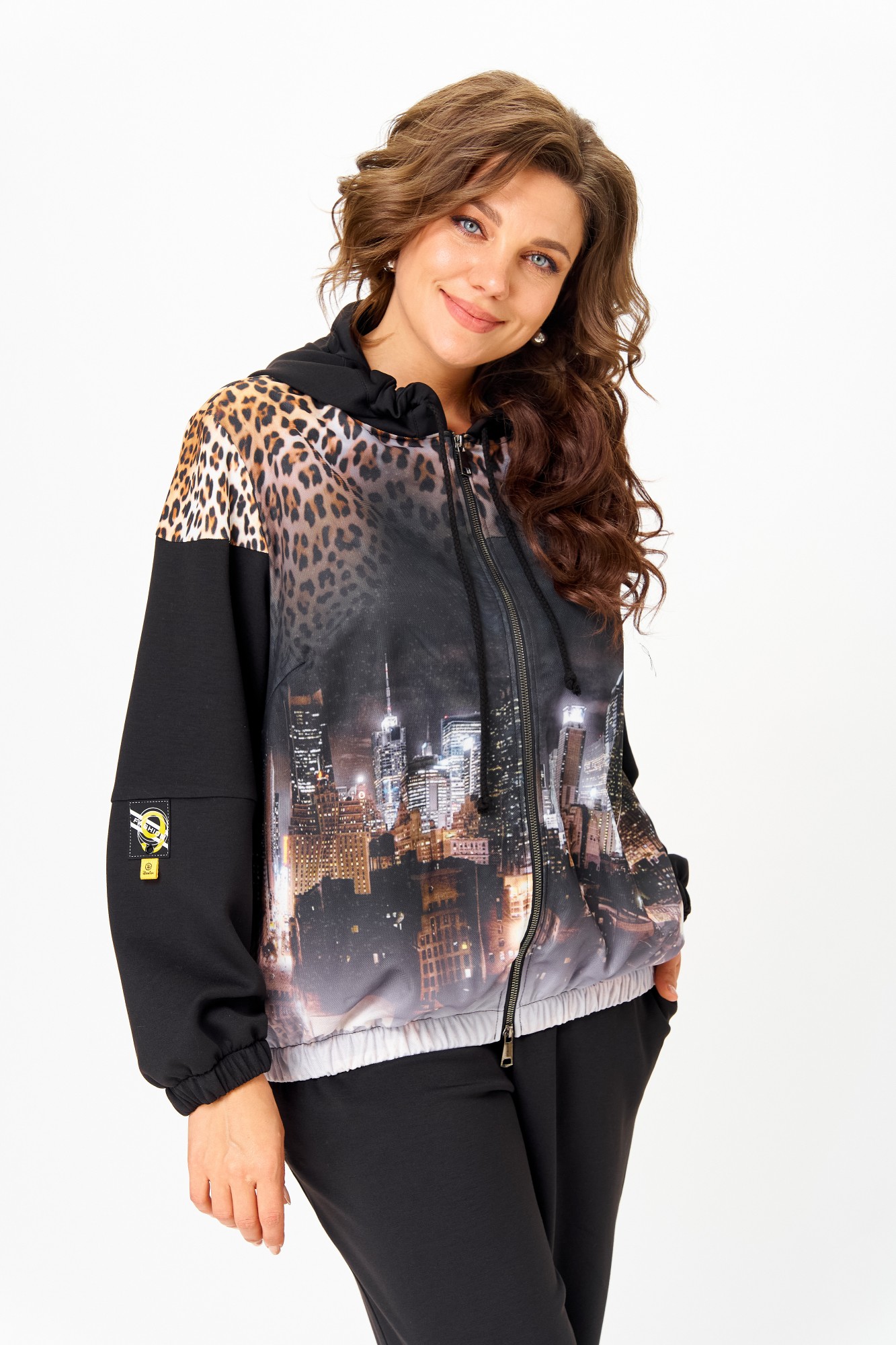 Костюм женский спортивный, состоящий из куртки и брюк. Костюм выполнен из 2-х видов ткани. Куртка с капюшоном свободного кроя на талии с прорезными карманами, застежка молния. Украшением куртки служит деталь из 3D сетки и нашивки на рукаве. Низ рукавов и низ куртки на эластичной манжете. Брюки заужены к низу, с карманами. Брюки на резинке по талии. Низ брюк на манжете с резинкой.