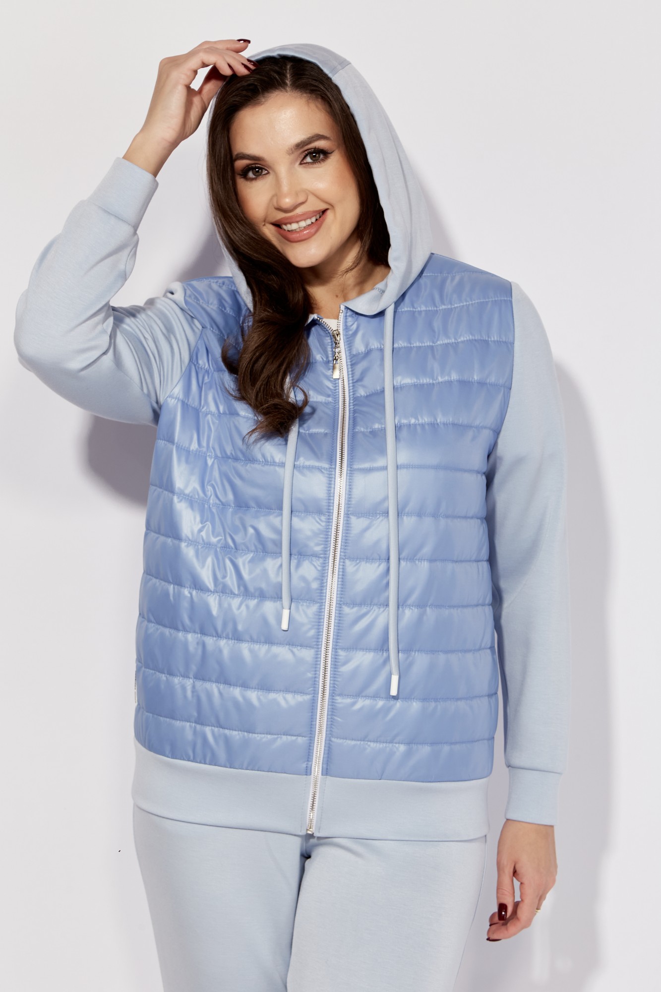Костюм женский, 2х предметный, состоящий из куртки-бомбера и брюк. Куртка прямого силуэта. Перед и спинка выполнены из двухсторонней, стеганой на синтепоне (W100) плащевки. Карманы в боковых швах. Рукав втачной, длинный, по низу на манжете. Горловина оформлена капюшоном с кулисой. Низ на манжете. Капюшон, рукава, манжета низа и брюк из трикотажного полотна. Брюки прямого силуэта с манжетой по низу. По переду карманы и горизонтальный подрез выше колена, акцентирован нашивкой. В нижней части вертикальные подрезы. По подрезам отделочные строчки. Пояс отрезной с резинкой по кругу.