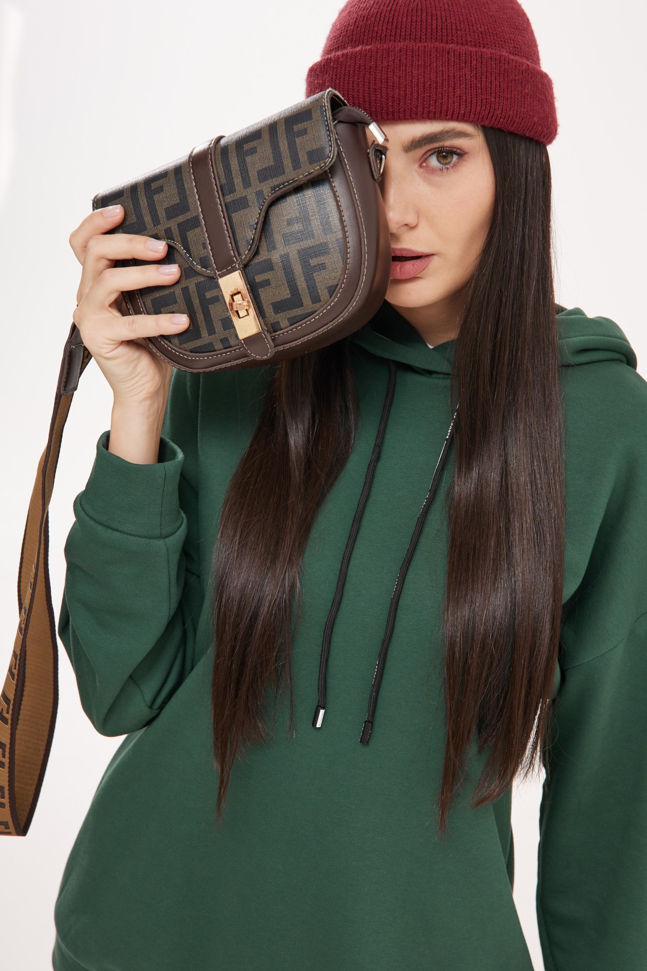 Костюм двойка включает в себя брюки с цельнокроенной манжетой и удлиненного худи с капюшоном.