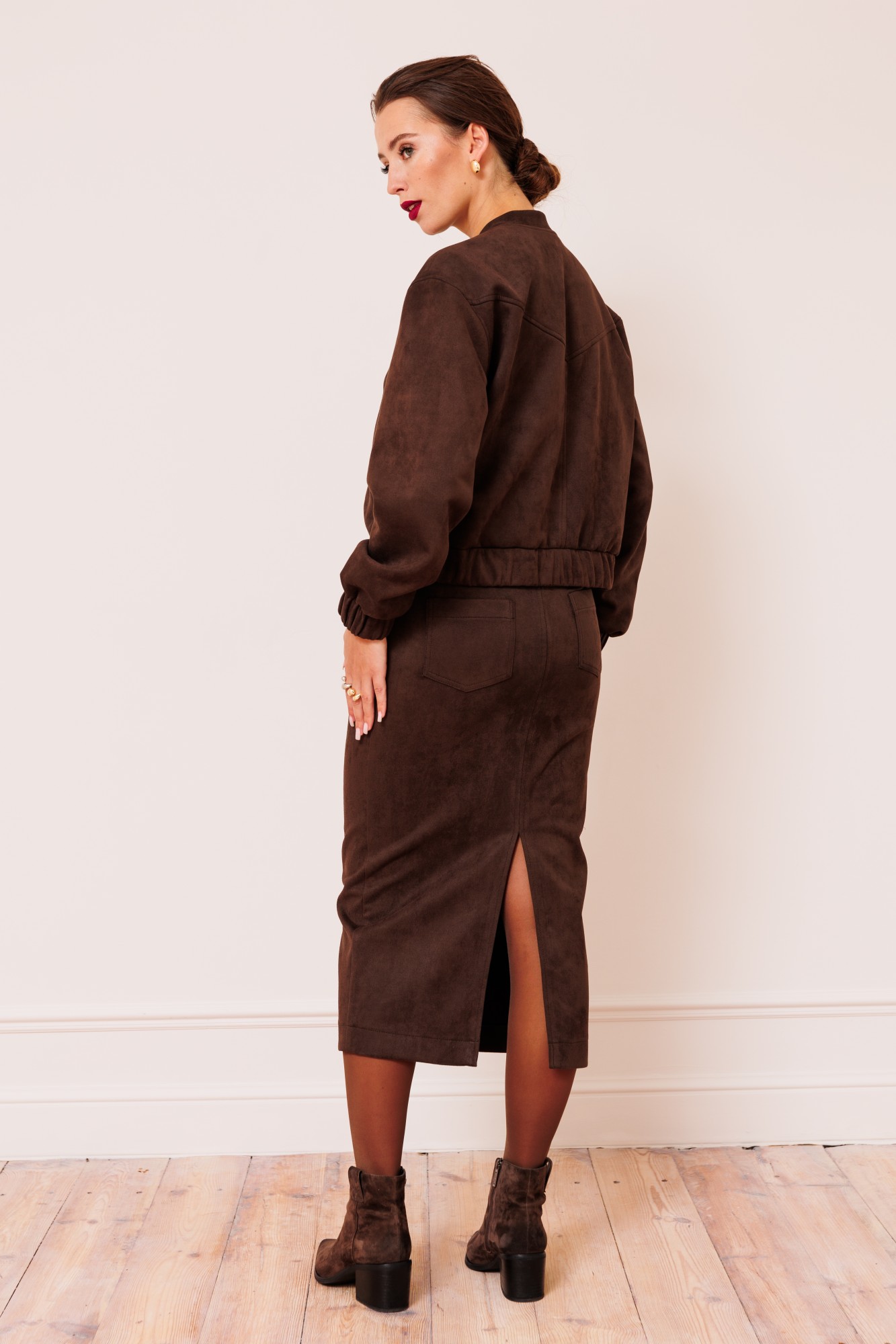 Юбка женская прямого силуэта, длинной миди зауженная к низу выполнена из мягкого, приятного в носке замша. Верхний срез юбки на обтачке. Переднее полотнище юбки со средним швом, в котором по низу обработан разрез, по верхнему срезу вставлена функциональная молния. По полочке кокетка и подрез между которыми обработан функциональный карман. Заднее полотнище юбки со средним швом, в котором по низу обработан разрез, также обработана кокетка и накладные карманы.