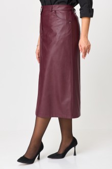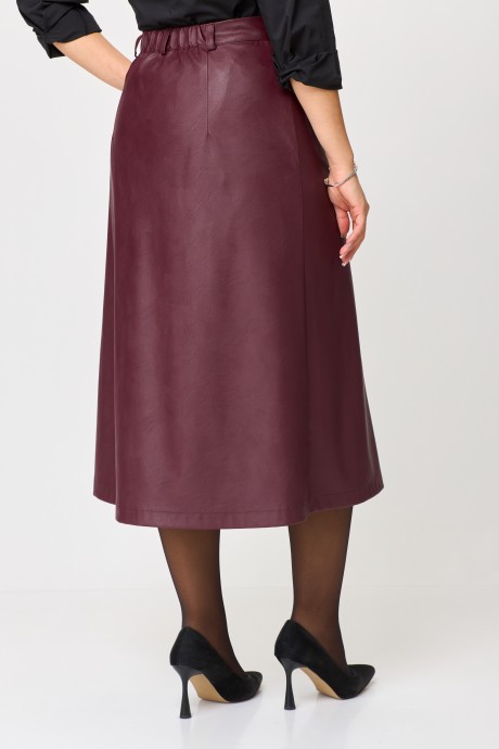 Юбка А-образного силуэта, длиной ниже колена, выполнена из экокожи. Юбка на подкладке. Передняя часть юбки с центральным швом в верхней части которого обработана застежка на молнию, в нижней части разрез. В верхней части передней половины обработаны обтачные фигурные карманы. Задняя часть юбки цельная, с таллиевыми вытачками. По талии юбка на притачном поясе с застежкой спереди на петлю и пуговицу. По задней части пояса между вытачками обработана эластичная тесьма. На поясе обработаны шлевки для ремня.
