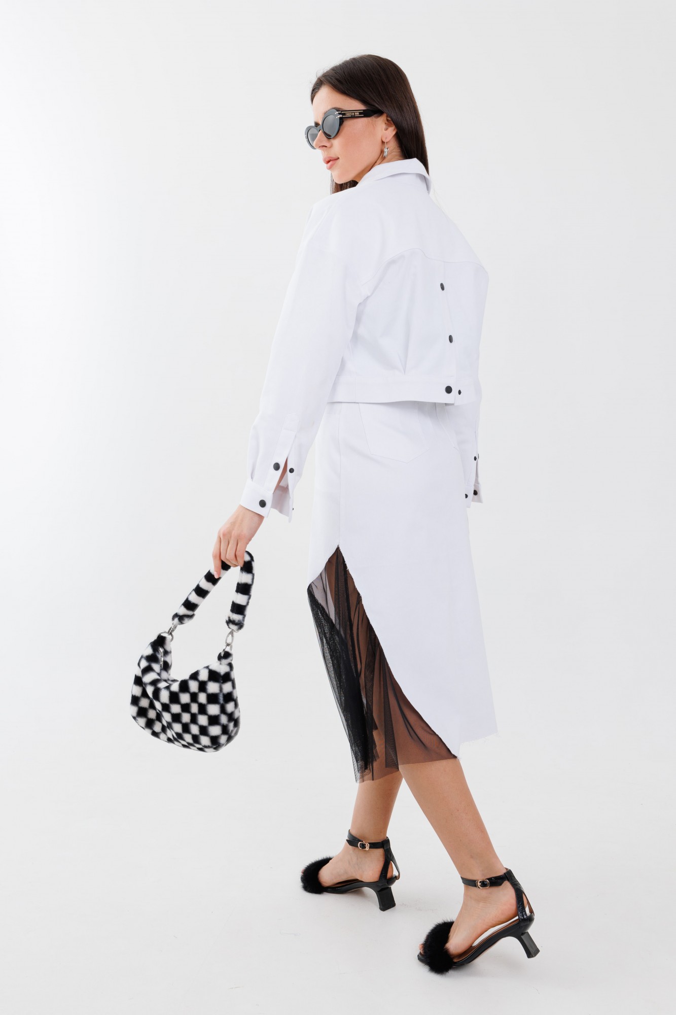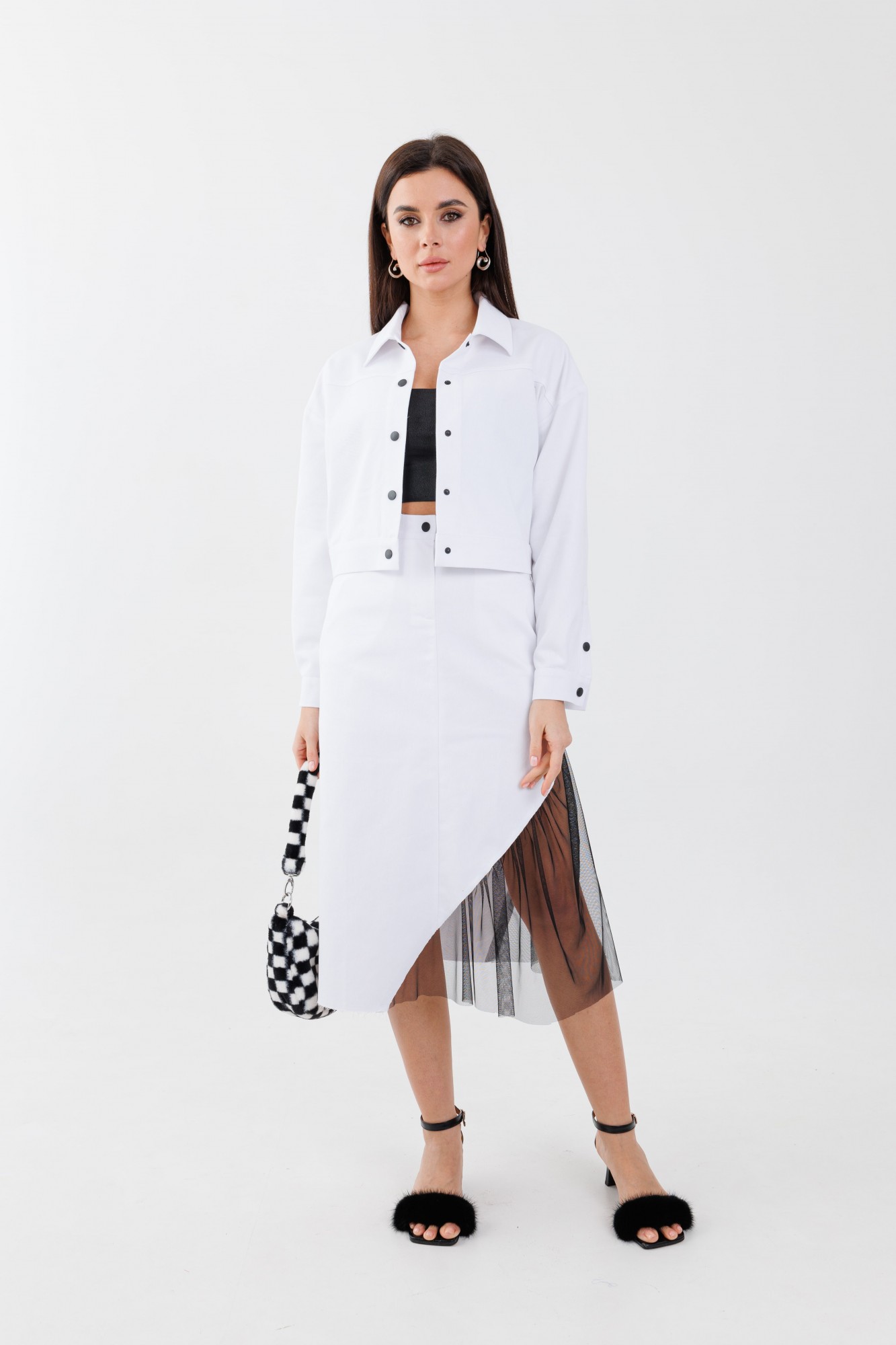 Джут короткий, до талии. Рукав длинный с манжетом. Застежка по переду на кнопки. Горловина обработана воротником. Спинка декорирована планкой на кнопках. Универсальная вещь в гардеробе каждой модницы, актуальна вне зависимости от сезона.
