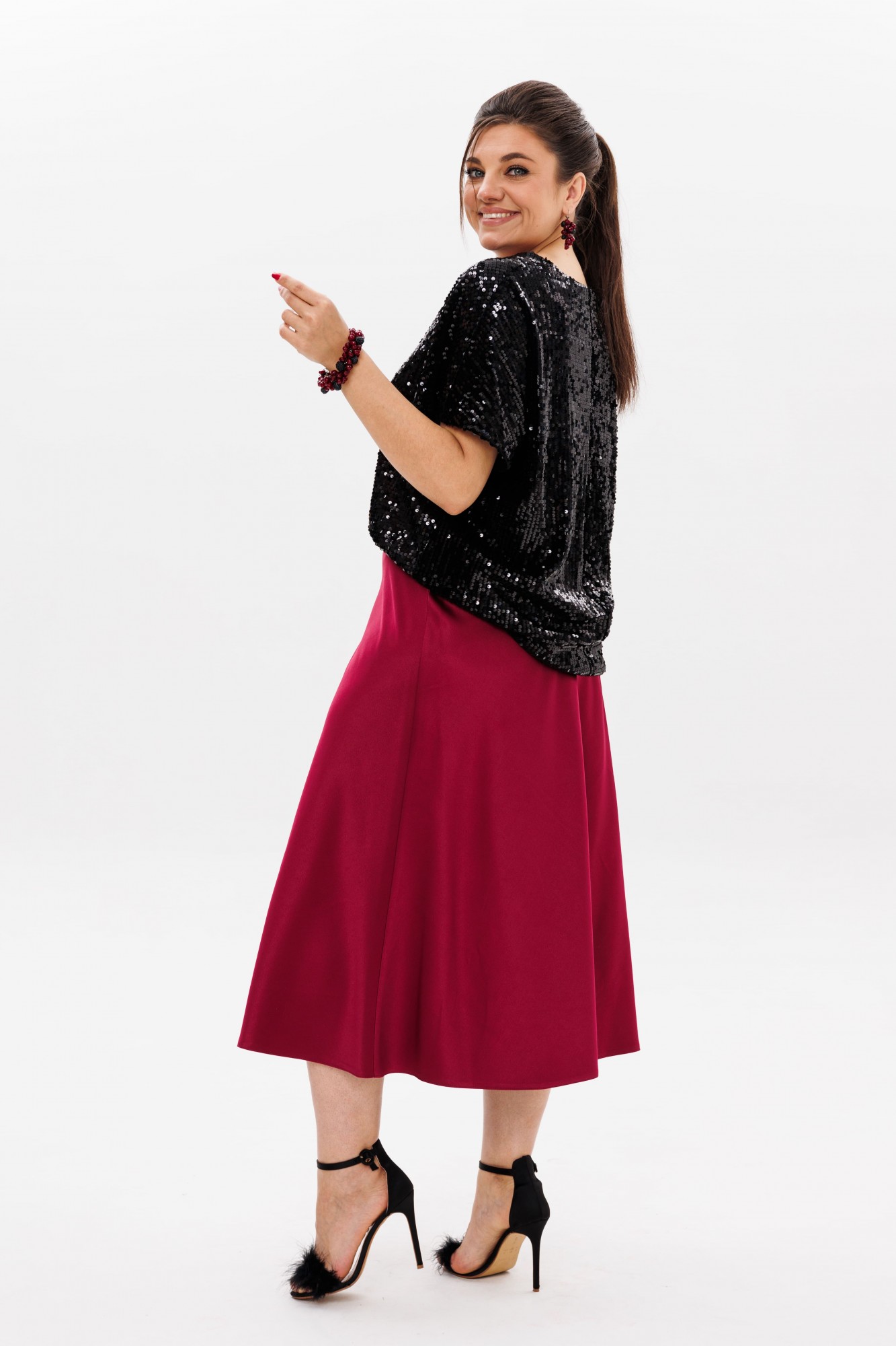 Верх юбки аккуратно обработан обтачкой, что придает ей завершенный и утонченный вид. Застежка на молнию обеспечивает надежную фиксацию и удобство в носке, а длина миди создает гармоничный силуэт, идеально подходящий как для торжественных мероприятий, так и для повседневной жизни.
