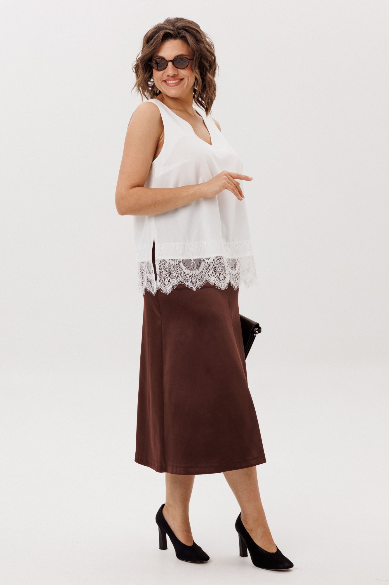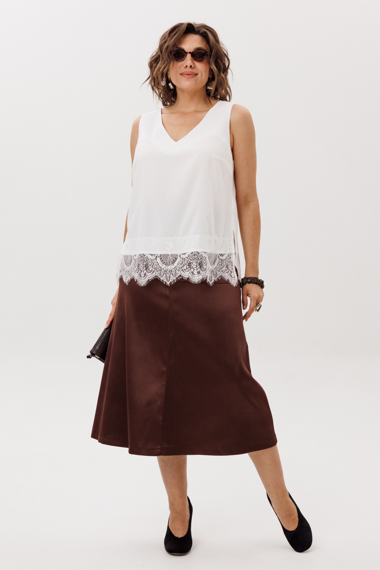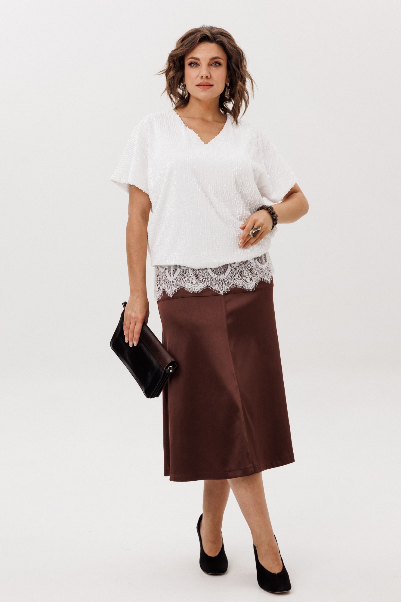 Представляем вам изысканную юбку от Анелли с трапециевидным силуэтом, которая станет незаменимым элементом вашего гардероба. Эта юбка идеально сидит на фигуре благодаря притачному поясу и удобной резинке на спинке, что обеспечивает комфорт и свободу движений в течение всего дня. Элегантная кокетка добавляет нотку утонченности, а расклешенный к низу крой создает легкость и воздушность, придавая вашему образу женственность и шарм. Потайная молния в боковом шве обеспечивает аккуратный внешний вид и легкость в надевании. Эта юбка прекрасно сочетается как с классическими блузками, так и с повседневными топами, позволяя вам создавать стильные образы для любого случая. Позвольте себе быть в центре внимания с этой великолепной юбкой, которая подчеркнет вашу индивидуальность и вкус! На модели топ 1644, блузон с пайетками 1522, жакет 1661, блуза 1679.