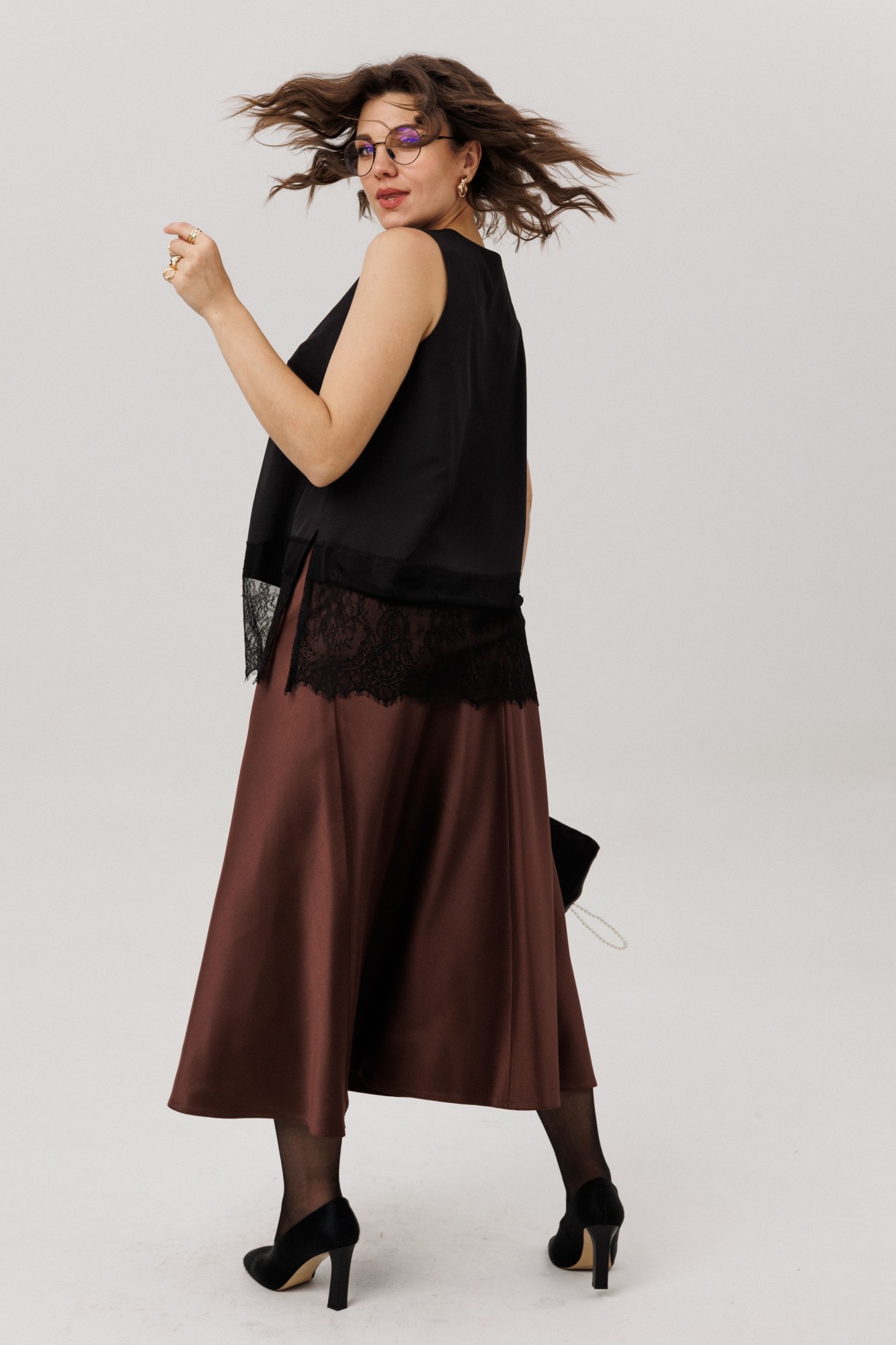 На модели в юбке цвета «горький шоколад» кружевной топ 1664 и блуза 1663.
