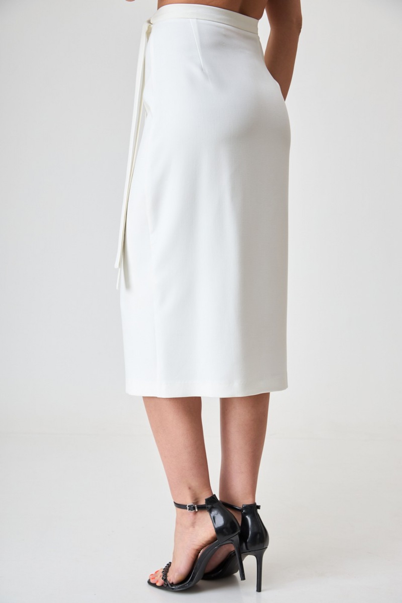 Юбка с элементом запаха, на притачном поясе. Выполнена из костюмной ткани в чёрном цвете, без подкладки. В новейших моделях запах располагается спереди сбоку. Это формирует изящный вырез треугольной формы, который смотрится очень женственно.