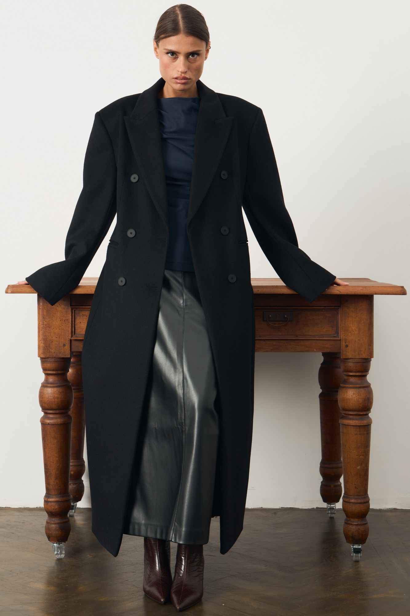 Юбка в длине миди из экокожи в глубоком сером цвете. Юбка на поясе, по переду потайная молния.
