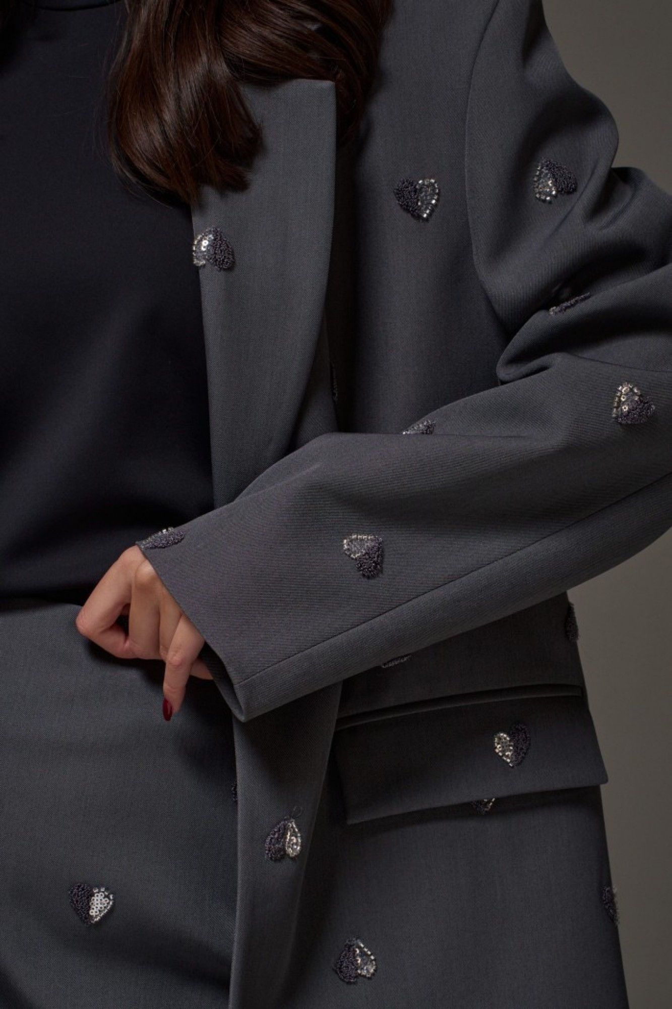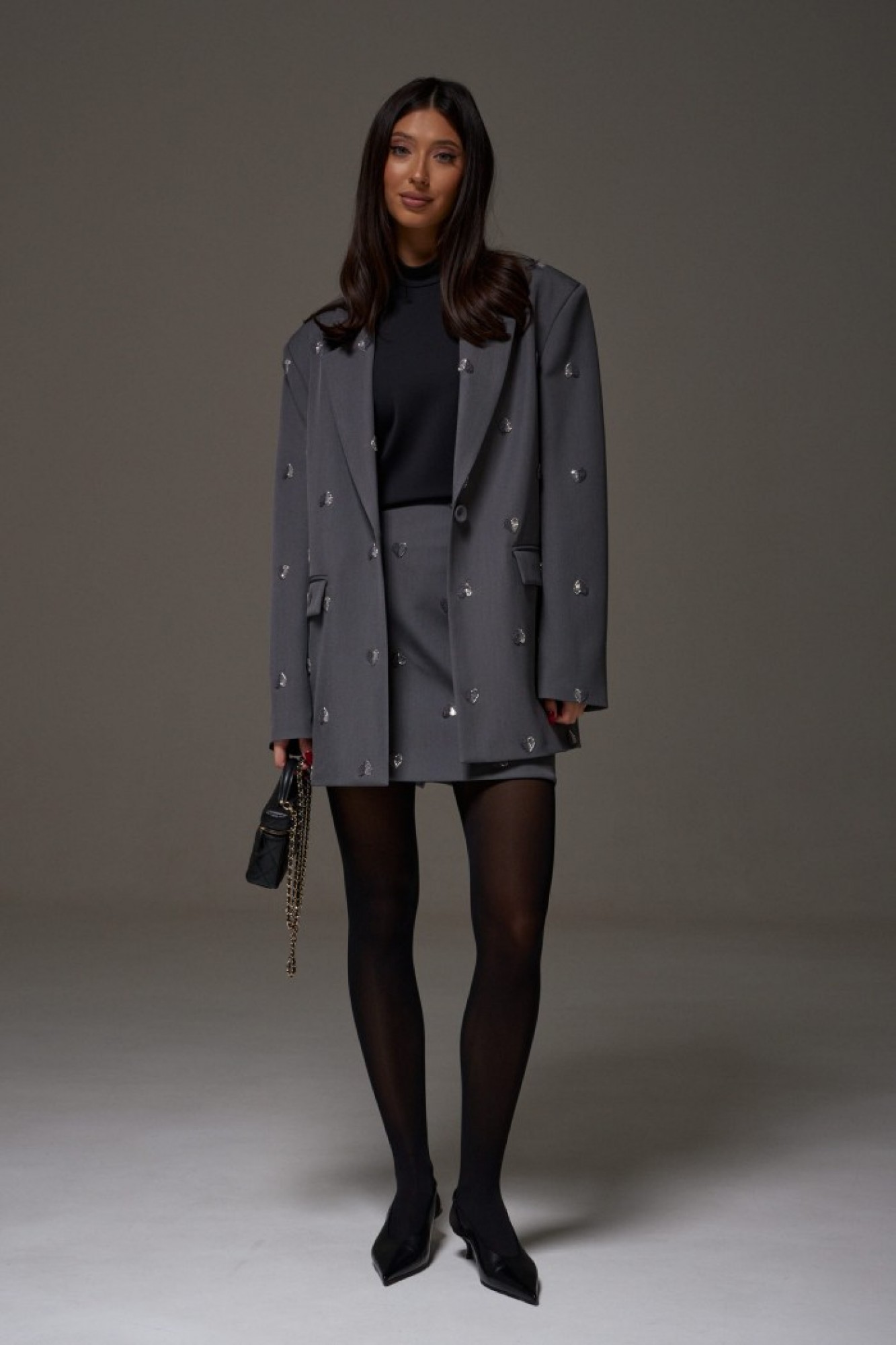 Юбка-мини прямого кроя. Выполнена из костюмной ткани серого цвета, декорированной сердечками. Силуэт - трапеция, брендированная подкладка. Застежка - потайная молния в шве заднего полотна изделия.