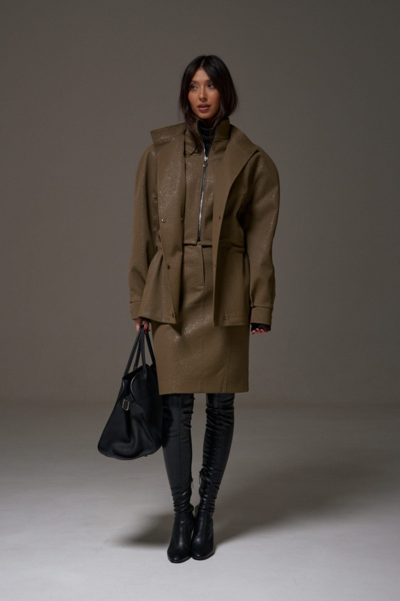 Юбка полуприлегающего силуэта выполнена из эко-кожи цвета хаки с теснением. Характеристики: стабильный пояс, застёжка центральная пуговица, молния, на брендированной подкладке, по передней и задней части изделия декоративные строчки, в среднем шве разрез 11 см.