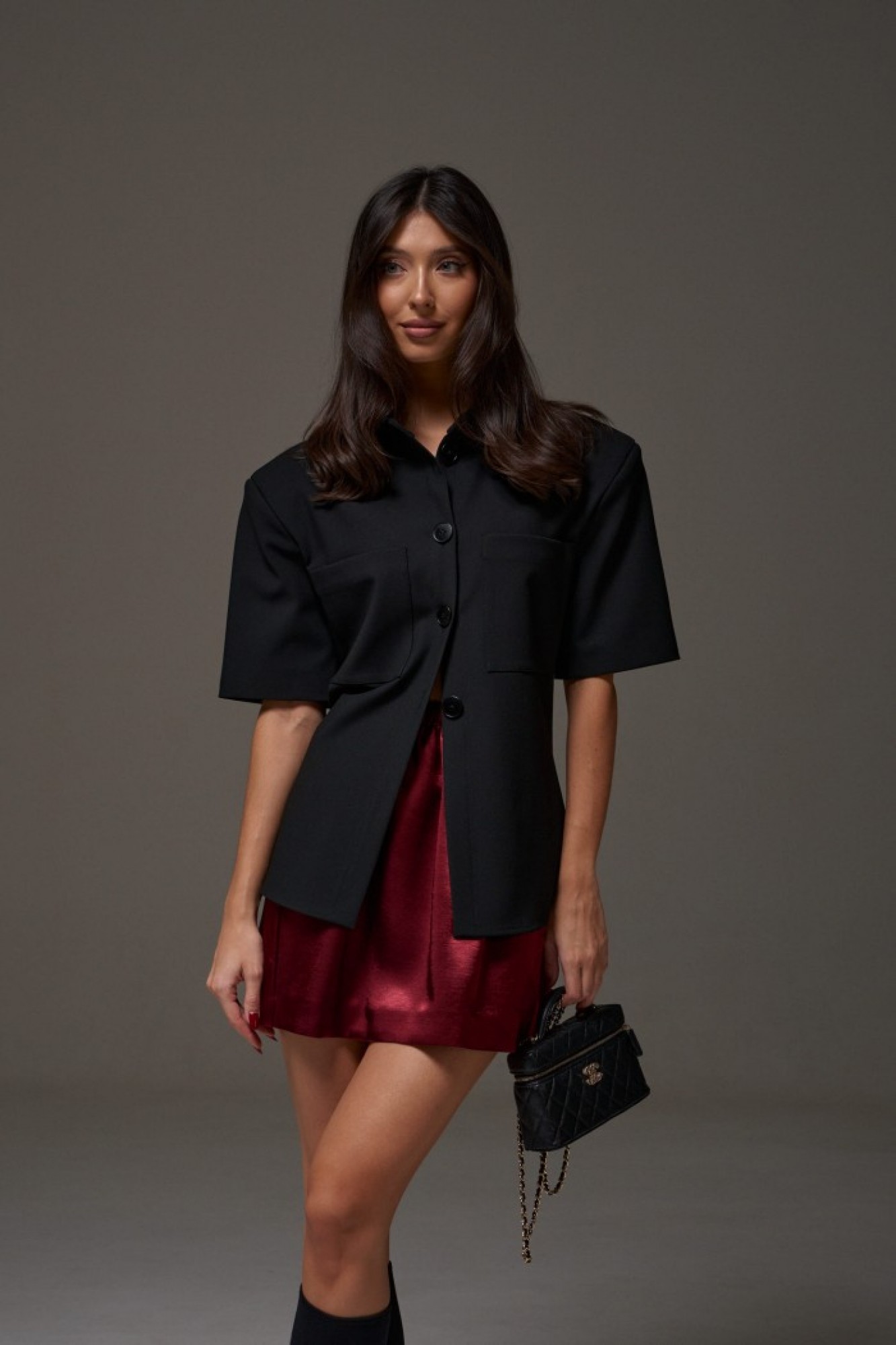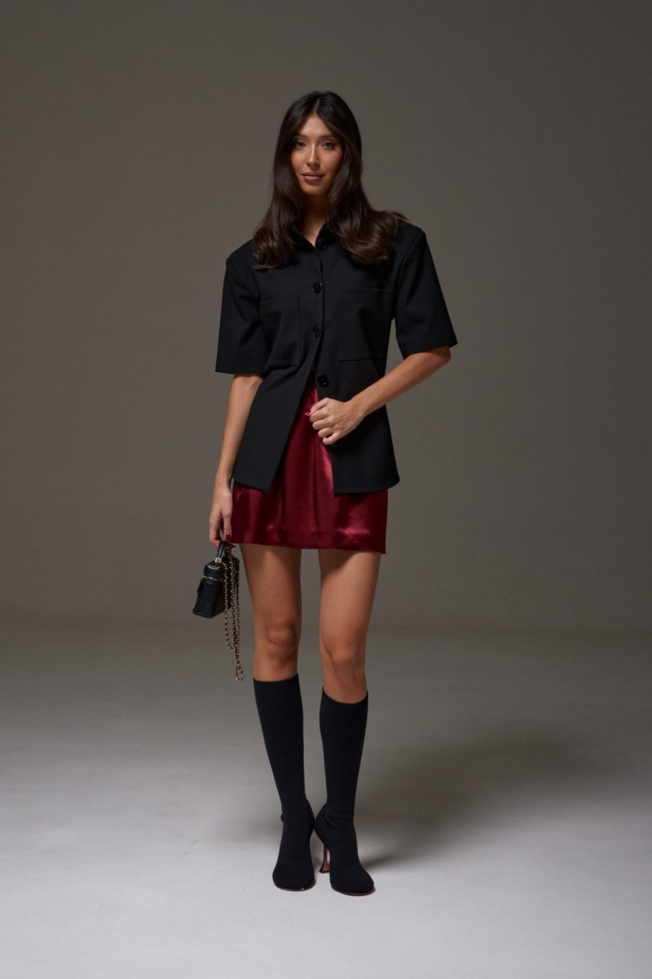 Юбка прямого кроя, выполнена из струящейся ткани бордового цвета. Характеристики: прямой крой, на подкладке, пояс на резинке.