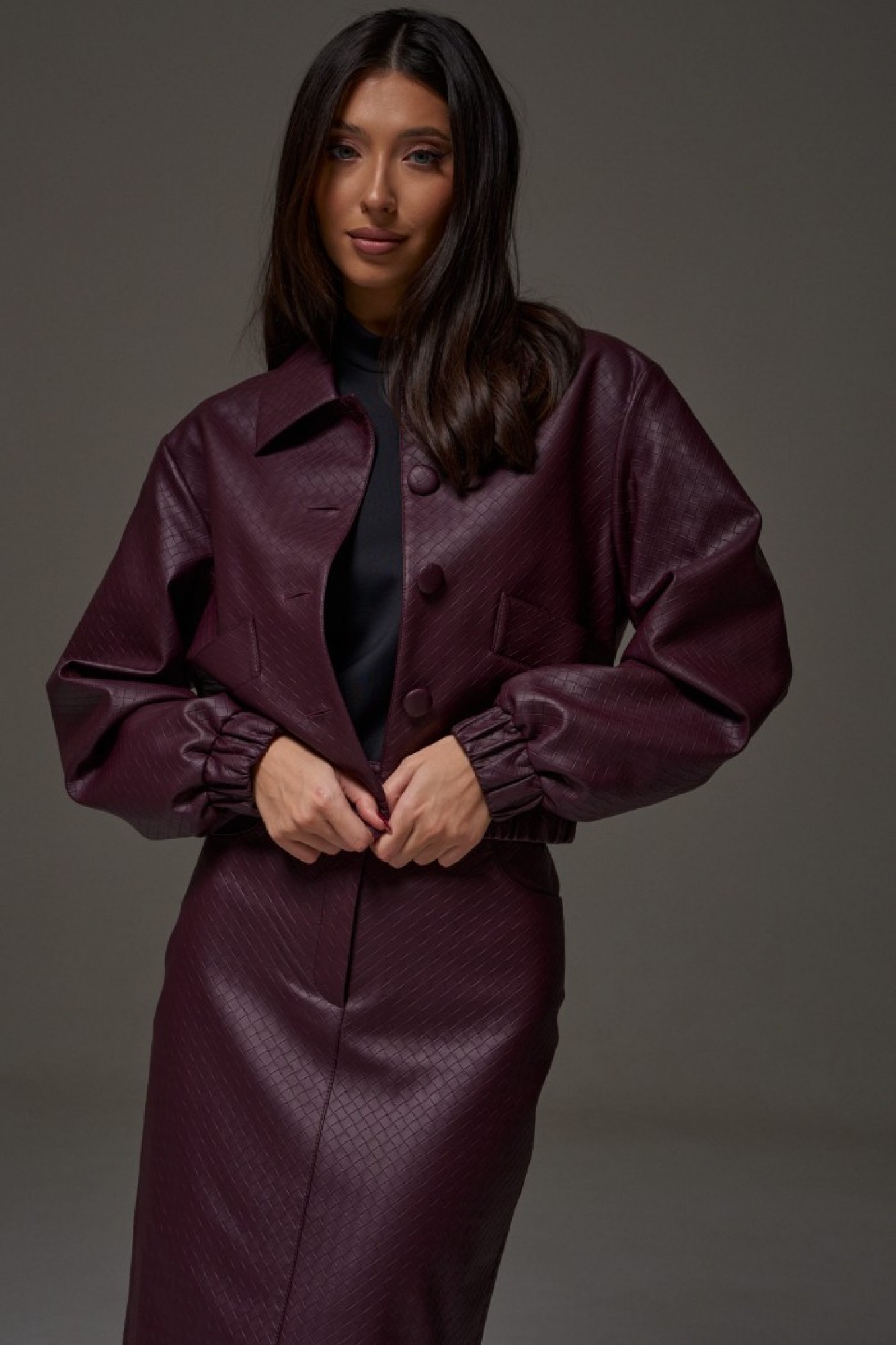 Юбка прямого кроя выполнена из фактурной эко-кожи бордового цвета. Характеристики: прямой крой, пояс стабильный со шлевками, на брендированной подкладке, застёжка центральная пуговица, молния, по передней части изделия прорезные карманы, по заднему полотну накладные карманы.