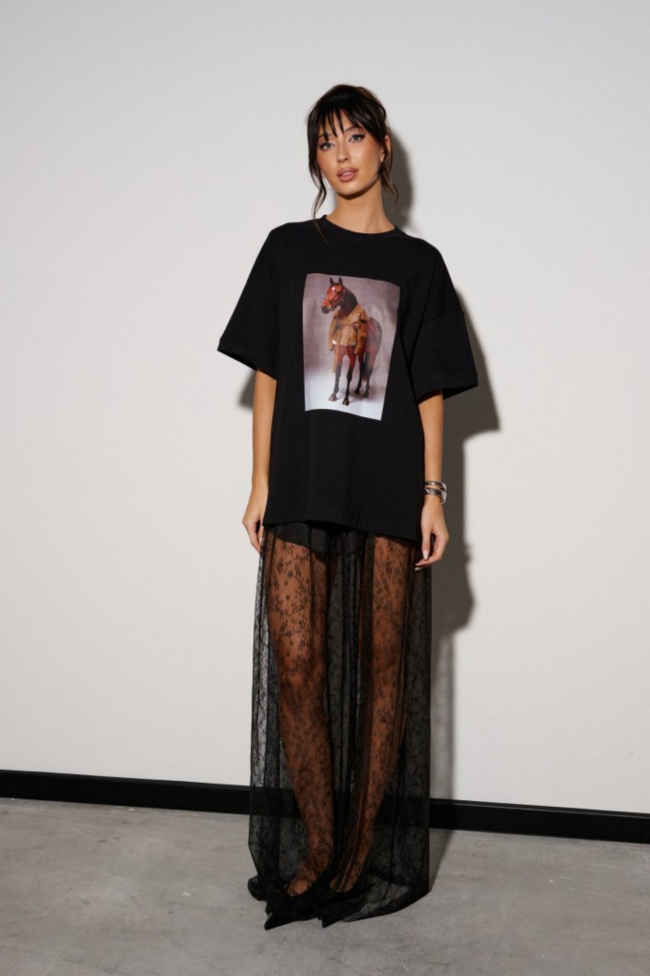 Юбка прямого кроя, выполнена из прозрачной ткани в сетку с декоративным узором. Характеристики: прямой крой, подкладка мини шортами, сзади изделия шов, пояс на резинке со сборкой.