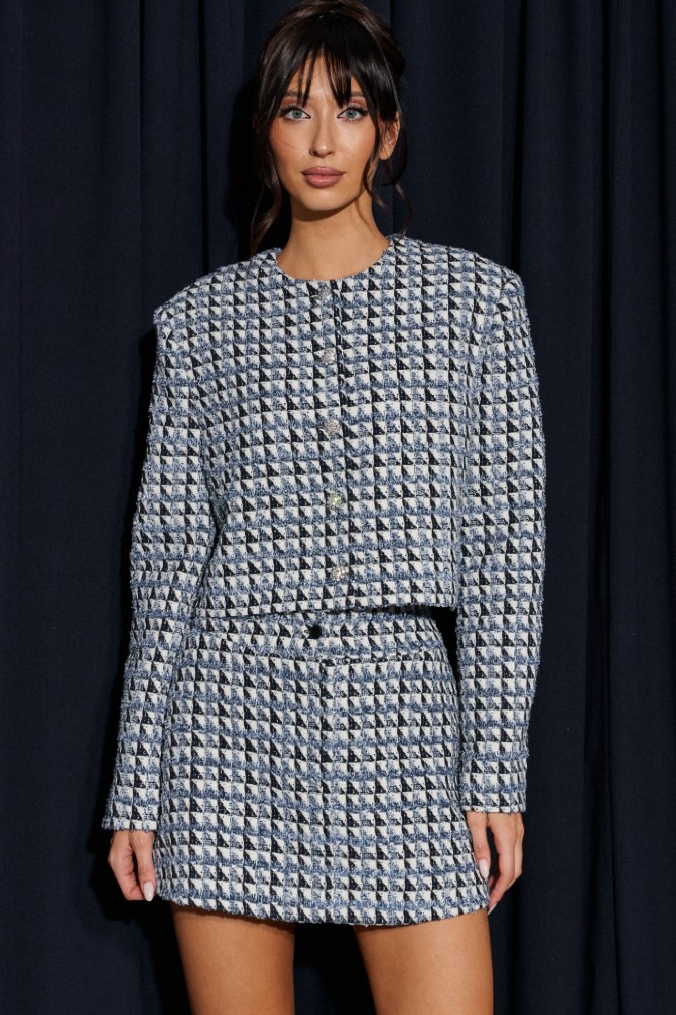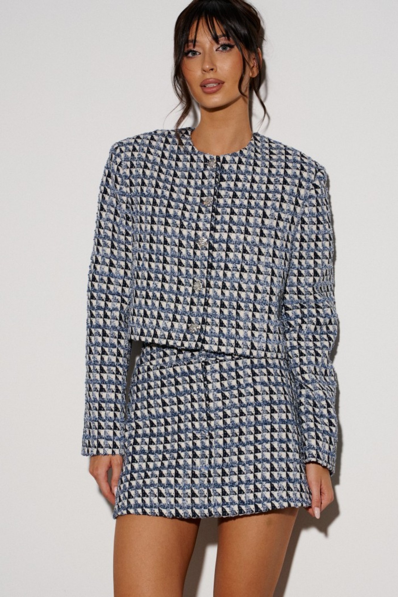 Юбка силуэт трапеция, выполнена из твидовой ткани. Характеристики: стабильный пояс, застежка центральная на петлю-пуговицу и потайную молнию. Брендированная подкладка. В боковых швах карманы.