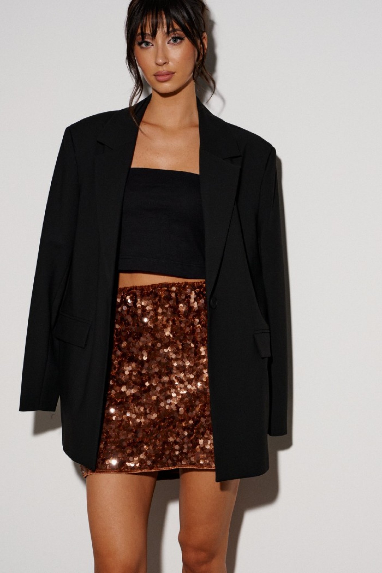 Юбка прямого кроя выполнена из бархатного полотна светло-коричневого цвета с пайетками. Характеристики: прямой крой, подкладка, пояс на резинке.