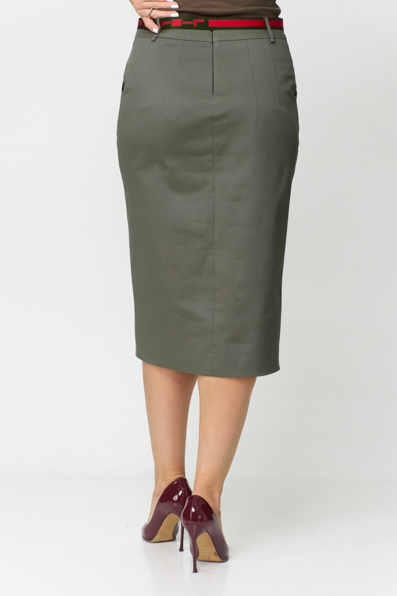 Юбка женская из хлопковой ткани. На подкладке, прямого силуэта, заужена к низу. Притачной пояс-кокетка, настрочены по переду накладные карманы и обработана по центру планка, которая заканчивается шлицей. Спинка со средним швом и талиевыми вытачками. В среднем шве застежка на потайную тесьму-молнию. К юбке прилагается пояс.