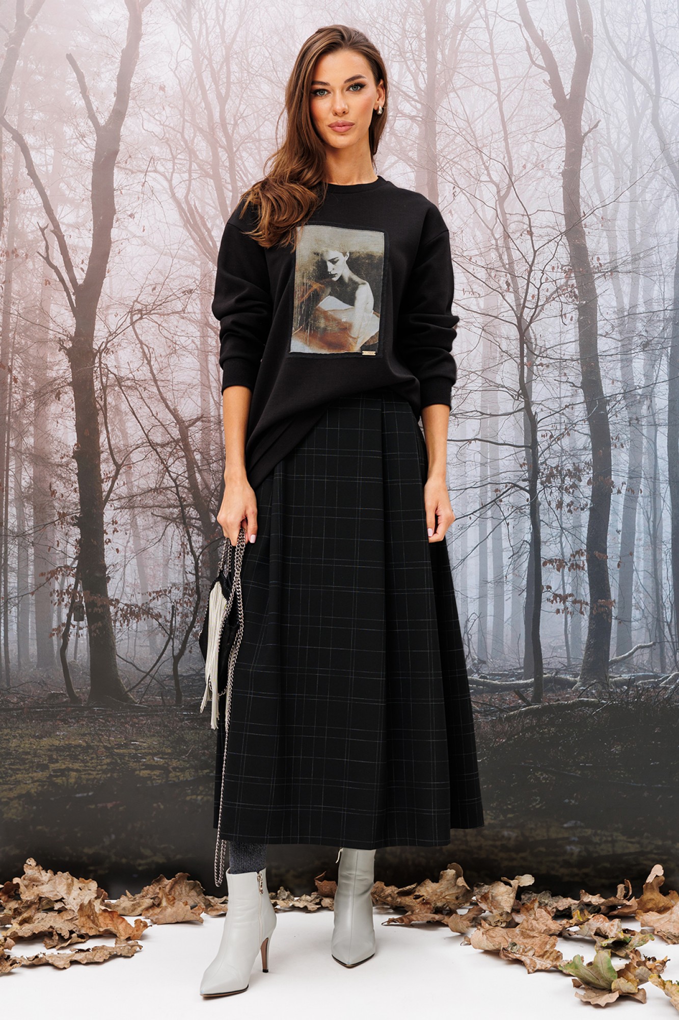 Юбка А-образного силуэта на приточном поясе. Юбка с карманами в боковых швах. Полочка и спинка с односторонними складками от притачного пояса. Спинка с центральным швом вверху с застежкой на металлическую тесьму-молнию. Юбка на трикотажной подкладке.