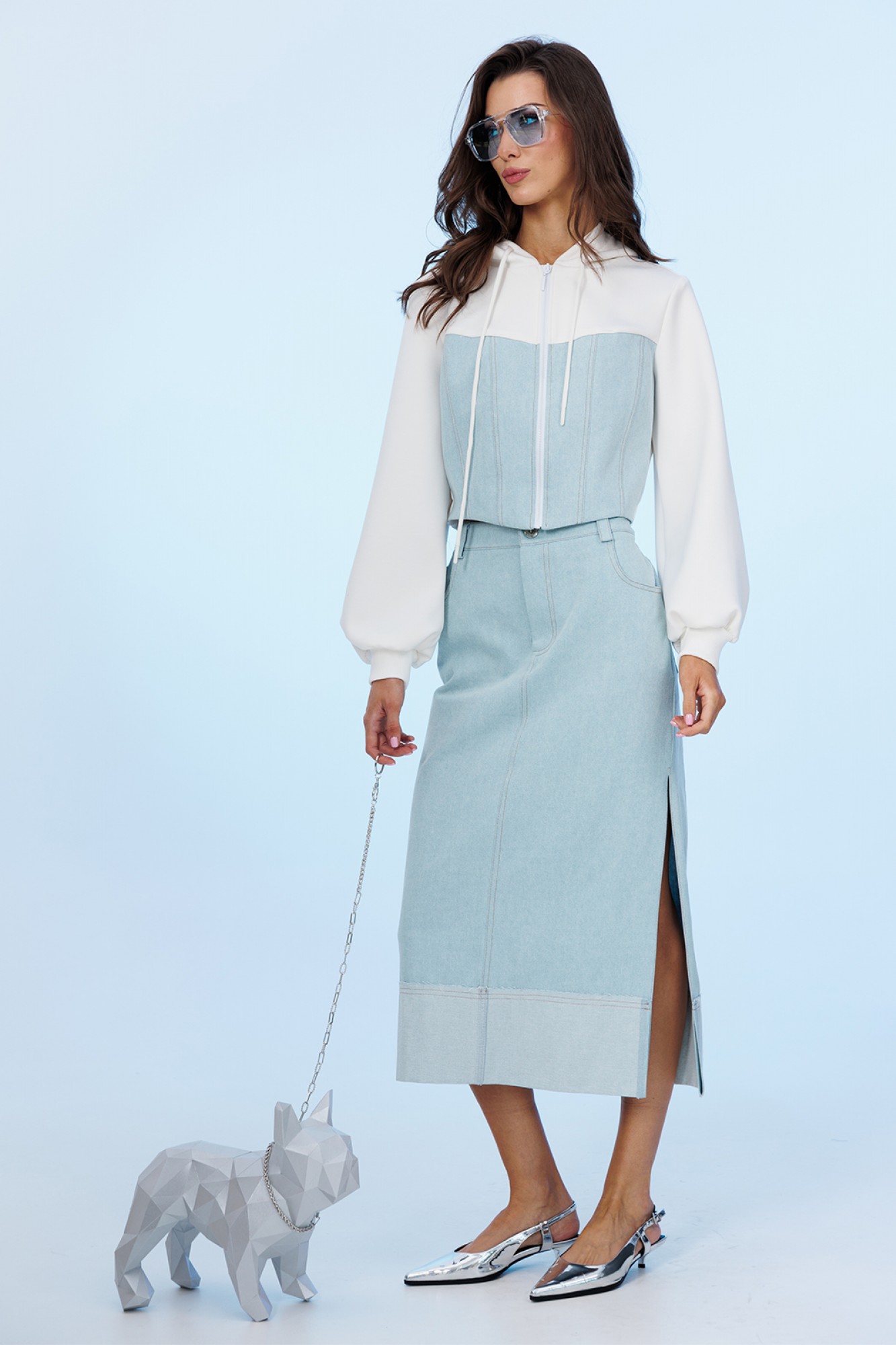 Юбка джинсовая, прямого силуэта длинной миди, на притачном поясе со шлёвками, застежкой-гульфик. По переду юбка с центральным швом и карманами. Сзади юбка с центральным швом, кокеткой и накладными карманами и с нашивкой на поясе. По левому боковому шву обработан разрез. Низ юбки подогнут, край которого не обработан.