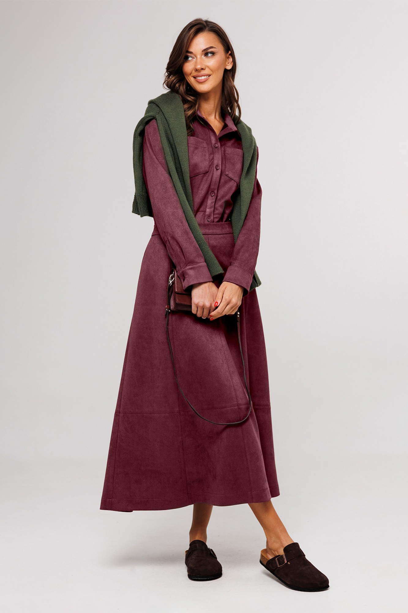 Юбка замшевая длинная А-силуэта на притачном поясе и карманами в боковых швах. Полочка и спинка с центральным швом, рельефами и горизонтальным подрезом. По спинке вверху в центральный шов вставлена металлическая молния. Юбка без подкладки.
