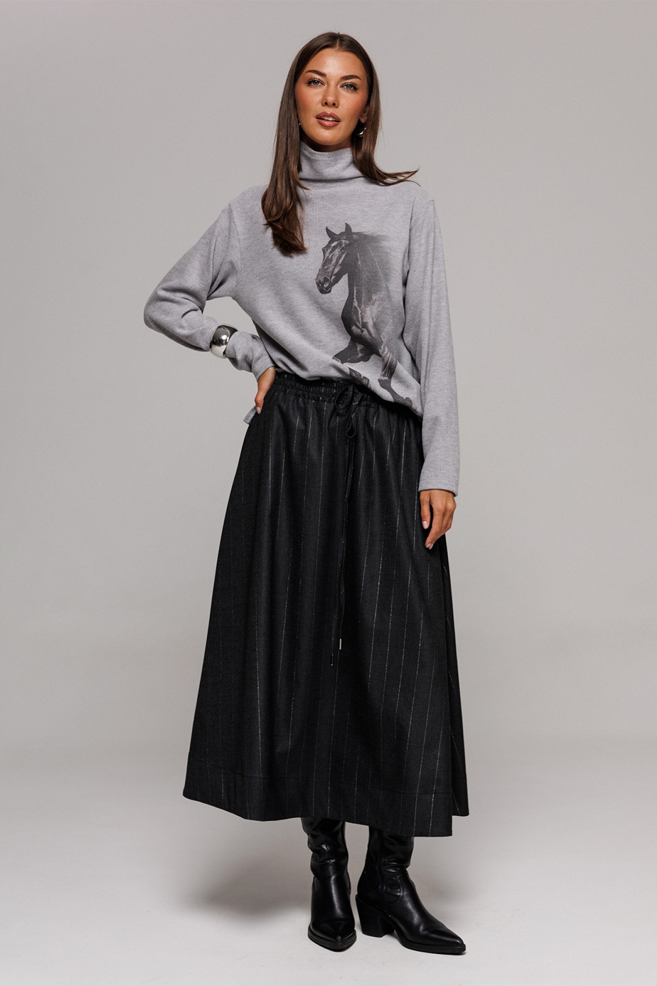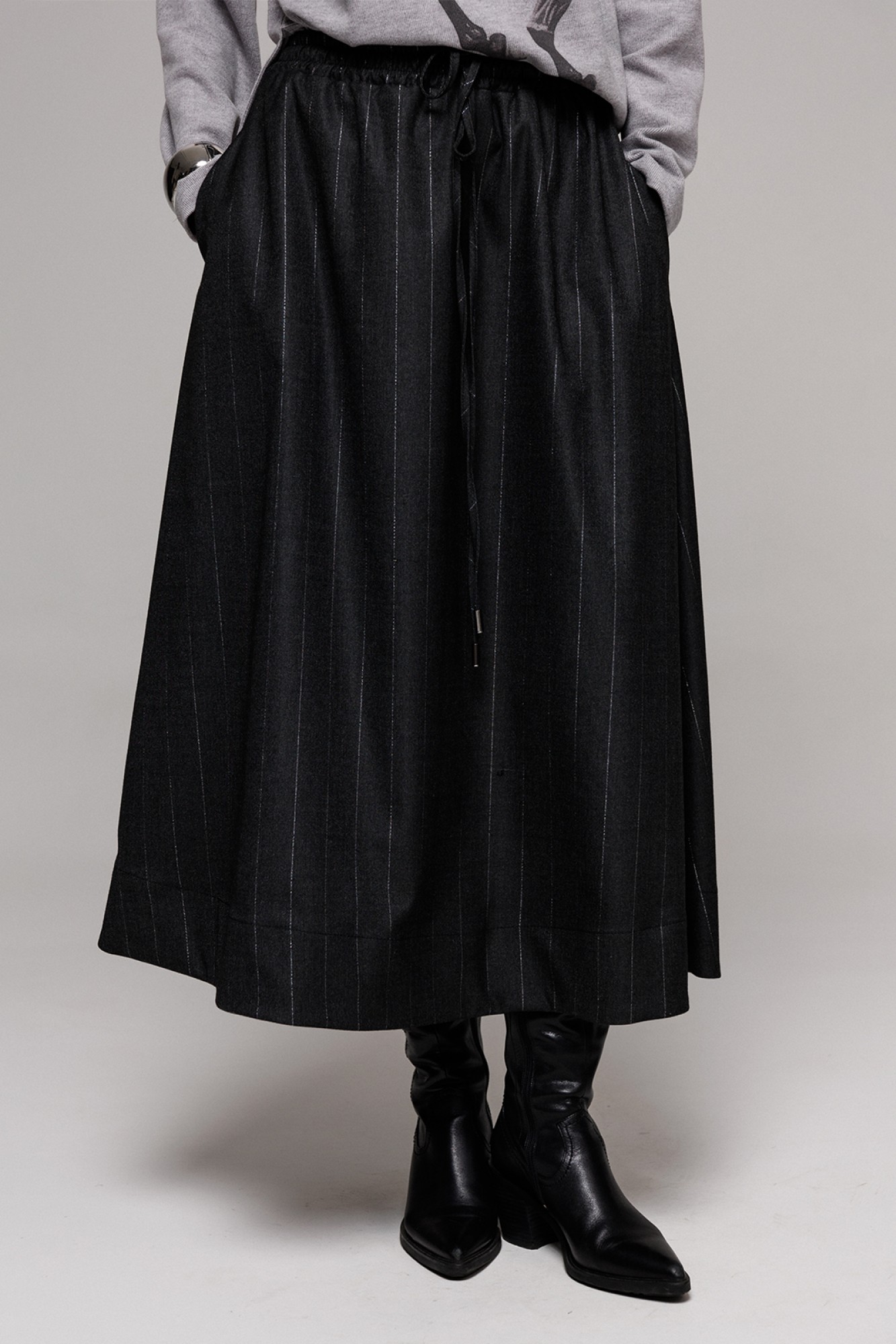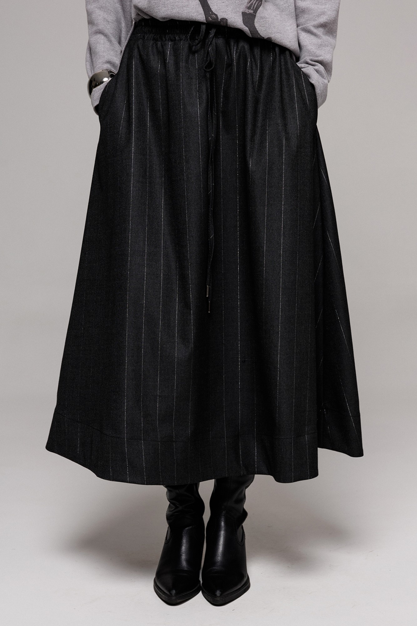 Юбка длиной миди из костюмной ткани в полоску из люрекса. А-силуэта на притачном отсроченном поясе на резинке со втянутым в него шнурком с наконечниками и карманами в боковых швах. По переду внизу нашивка "BUTER". Юбка без подкладки.