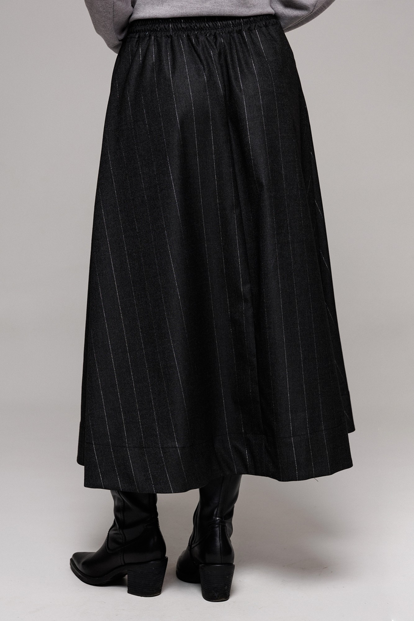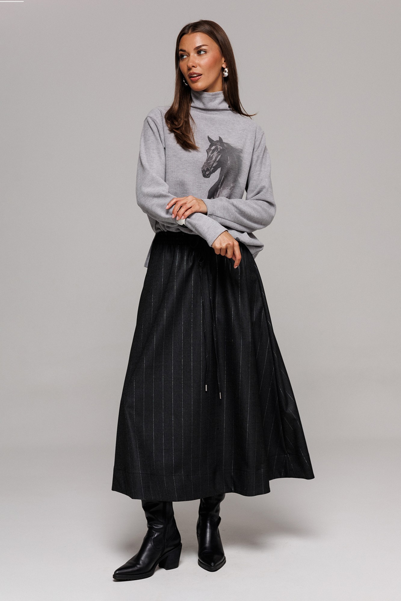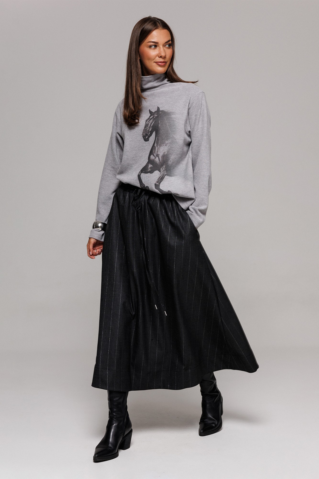 Юбка длиной миди из костюмной ткани в полоску из люрекса. А-силуэта на притачном отсроченном поясе на резинке со втянутым в него шнурком с наконечниками и карманами в боковых швах. По переду внизу нашивка "BUTER". Юбка без подкладки.