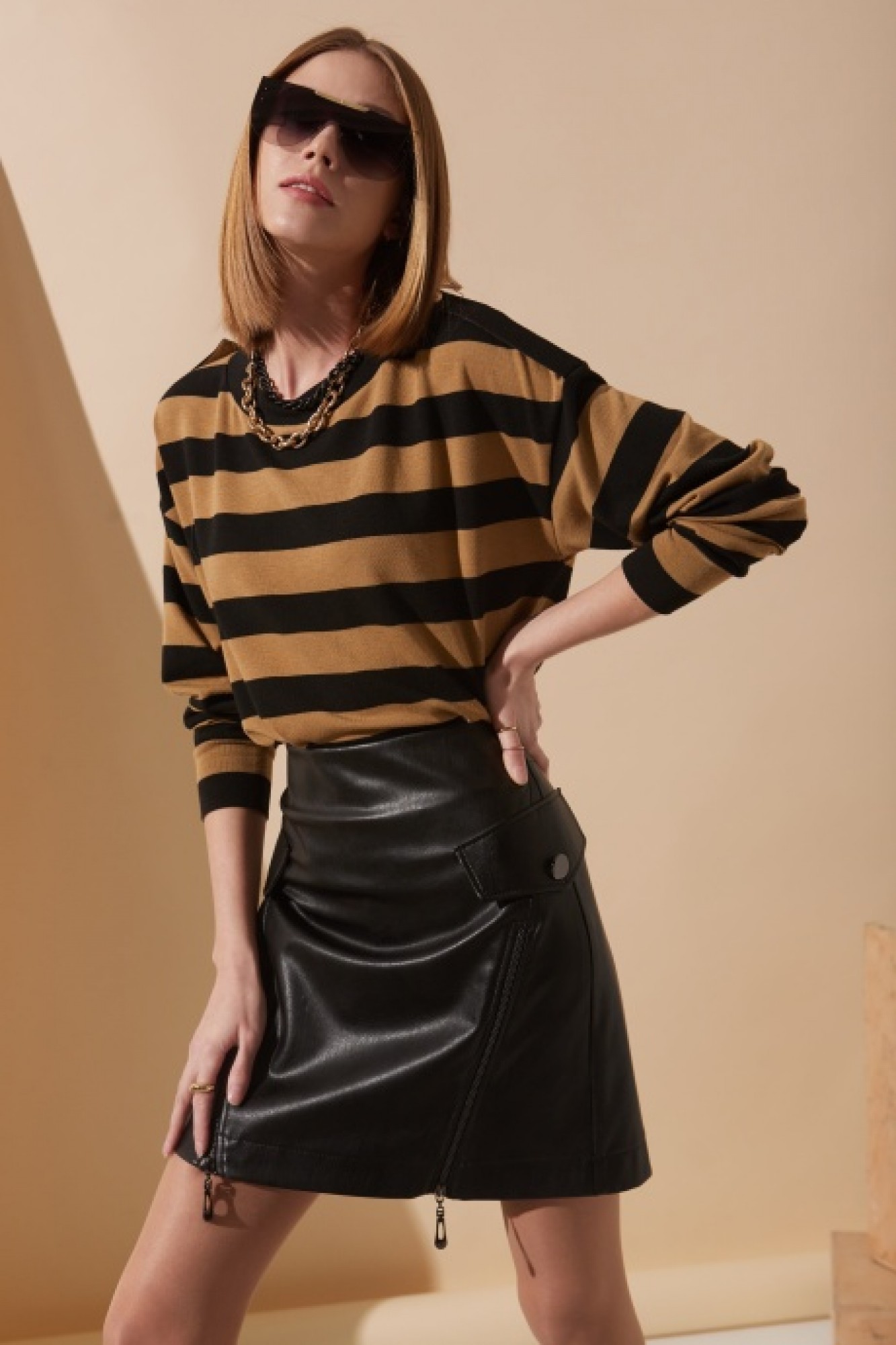 Юбка из мягкой эко кожи на замшевой основе, А- силуэта, с посадкой на талии, длиной выше линии колена. Перед с диагональными рельефами от верхней точки бокового шва, с металлическими молниями в шве рельефа и фигурными клапанами на уровне бёдер, переходящими на спинку, с декоративной пуговицей по центру клапанов. Спинка с застёжкой на потайную тесьму-молнию в среднем шве, с поясом обтачкой и застёжкой на две петли и пуговицы. По клапанам и вдоль молнии прострочены отделочные строчки. Юбка на подкладке.