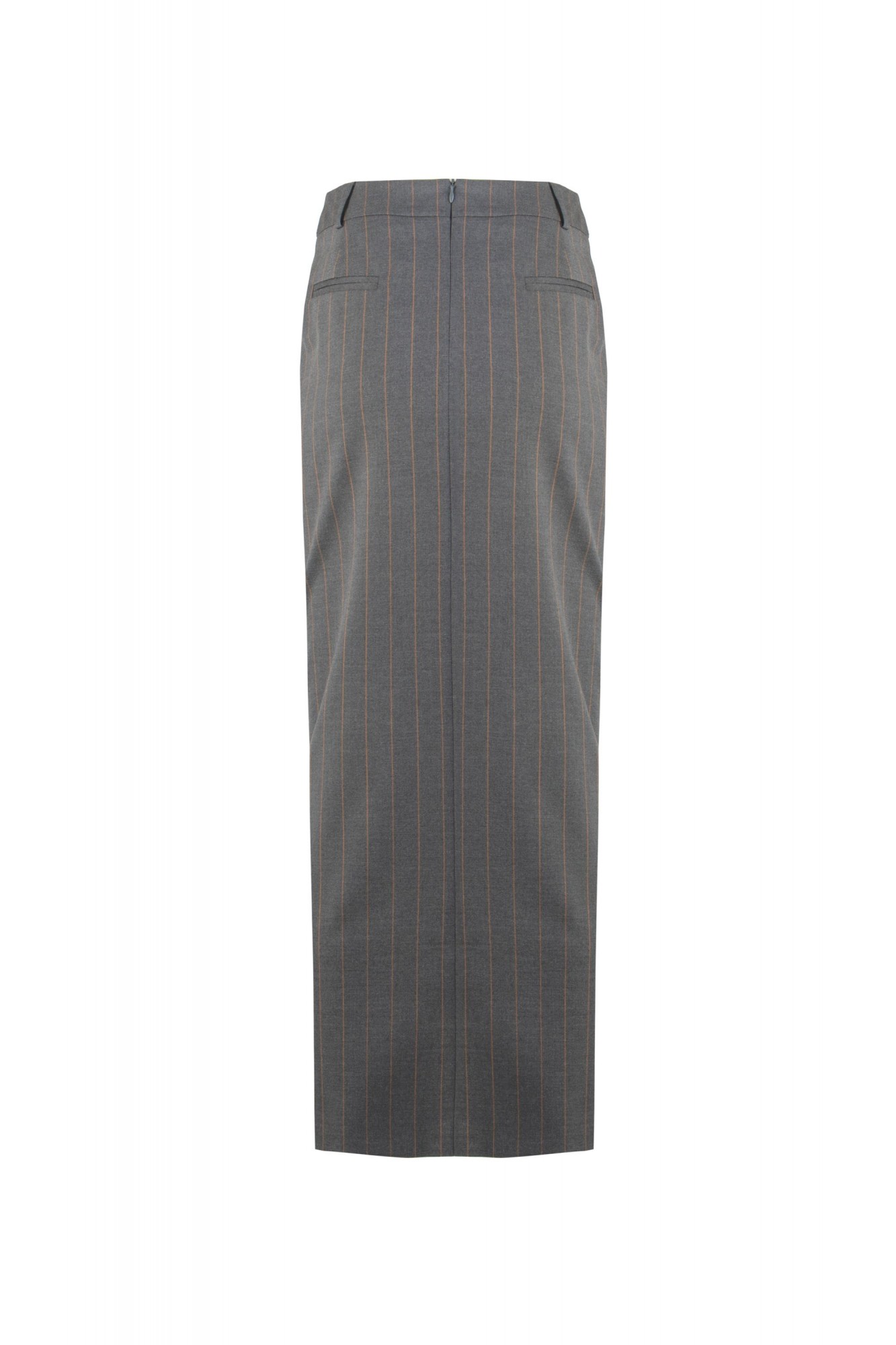 Юбка женская, длинная, с отлетной подкладкой по низу, с передними наклонными боковыми карманами. По переднему полотнищу в нижней части обработан разрез. В верхней части среднего шва заднего полотнища потайная молния. По задним полотнищам юбки обработаны фиктивные прорезные карманы в «рамку». Пояс притачной со шлевками.