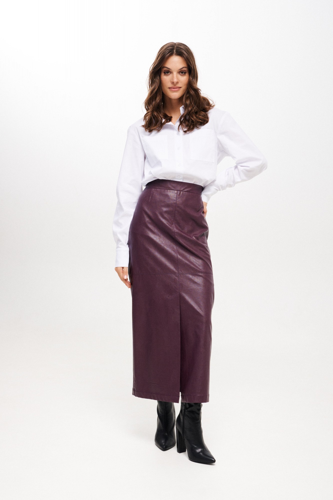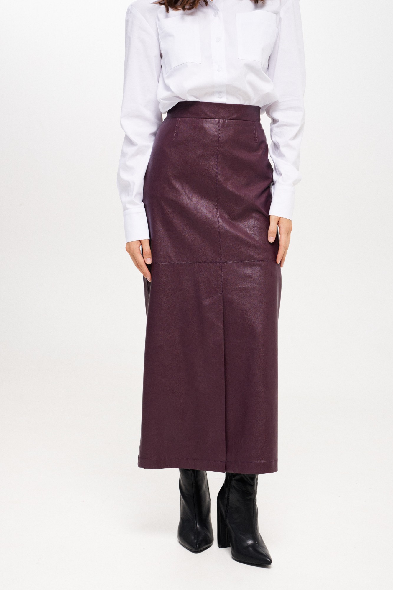 Юбка женская, приталенного силуэта, длиной миди из ЭКО кожи. Перед со средним швом, функциональной шлицей и поперечным подрезом, талиевыми вытачками. Заднее полотнище со средним швом и застежкой на потайную молнию в нем, переходящую в пояс, талиевыми вытачками и поперечным подрезом. Пояс юбки частично на резинке. Средние и поперечные швы, вытачки отстрочены декоративными отделочными строчками. Юбка на подкладке.