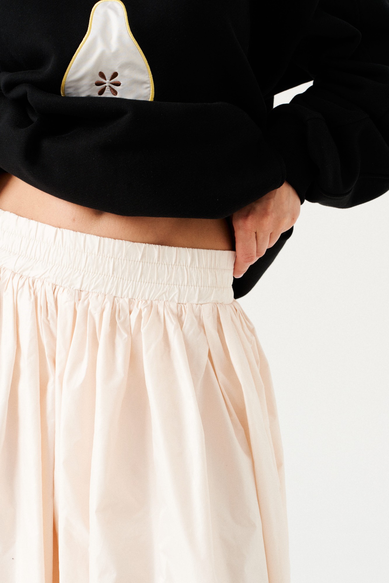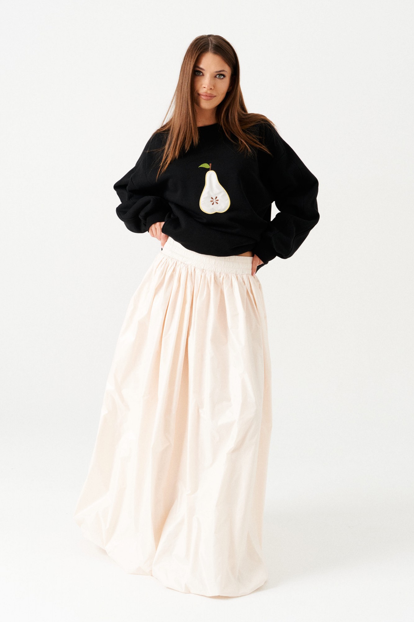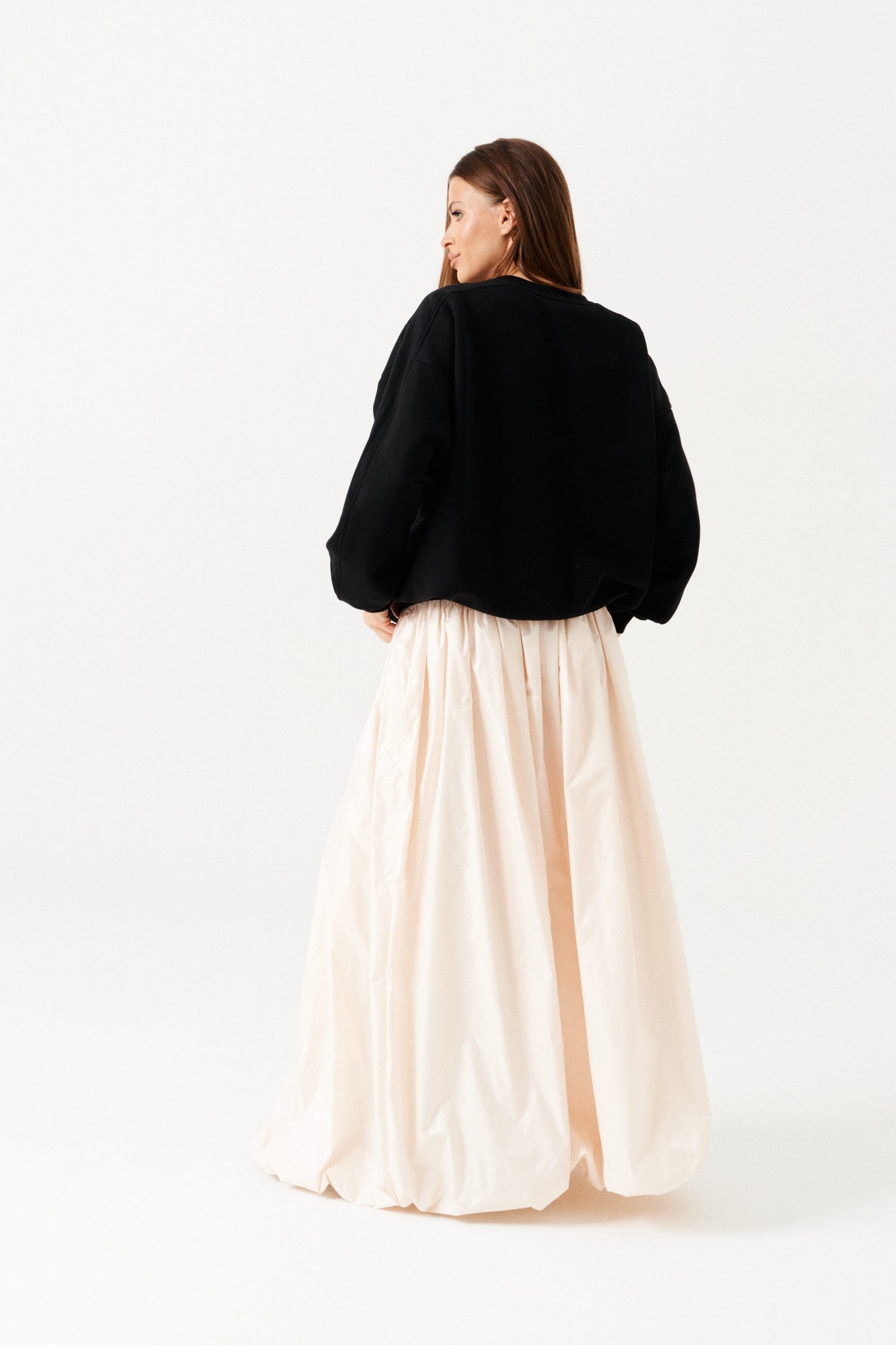 Юбка-баллон большого объема, расширенная книзу, со сборкой по верхнему и нижнему срезу, на притачной подкладке. Пояс на резинке. Длина – макси.