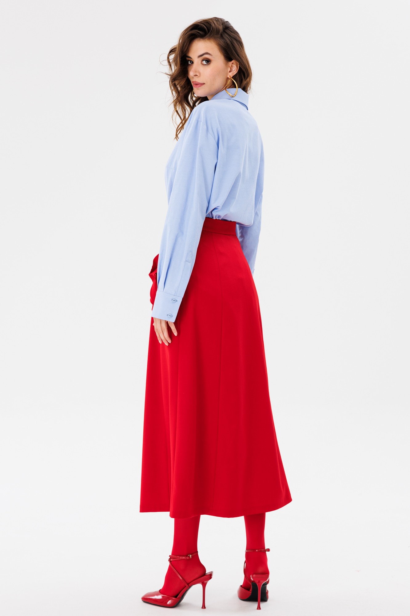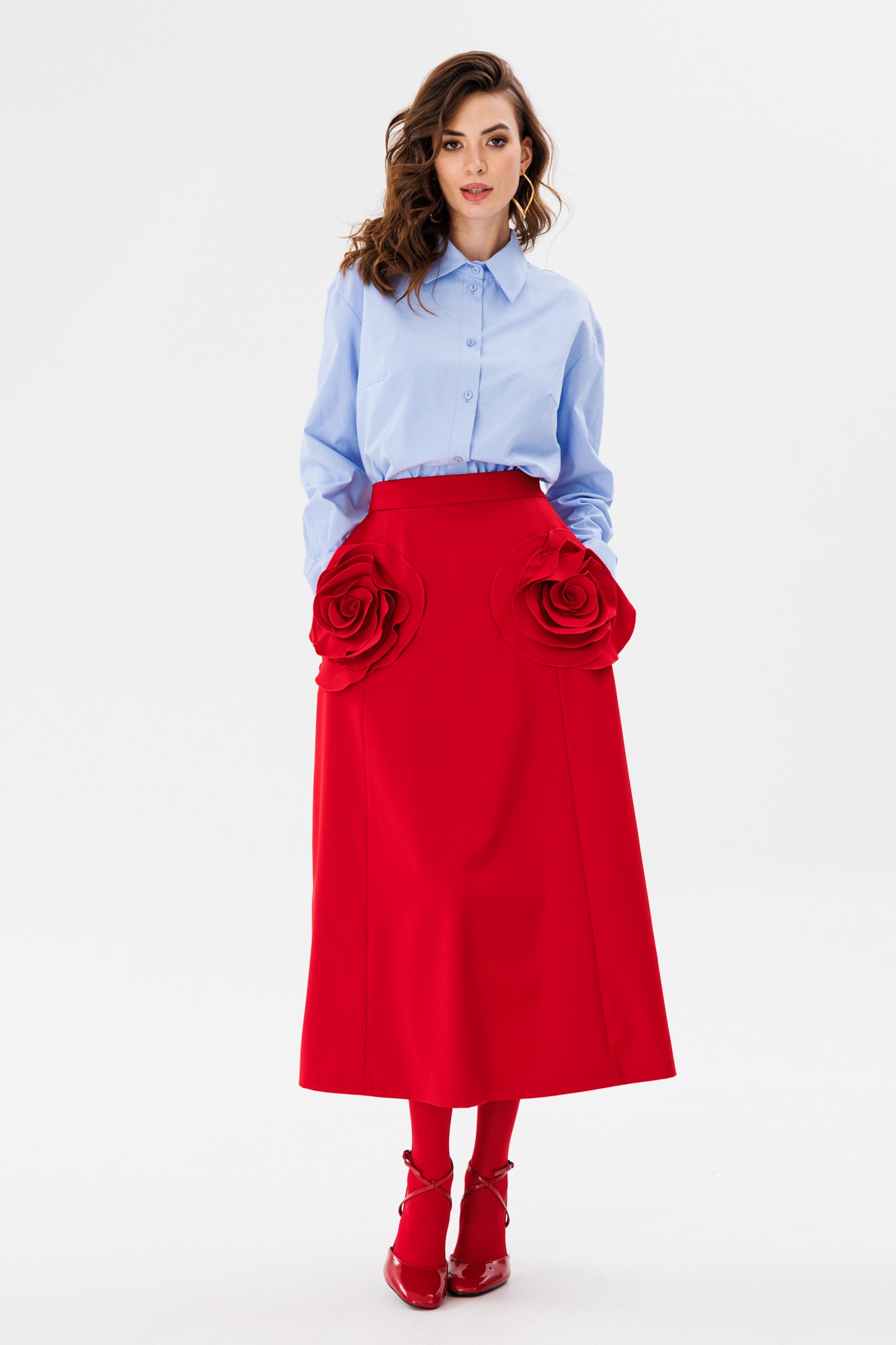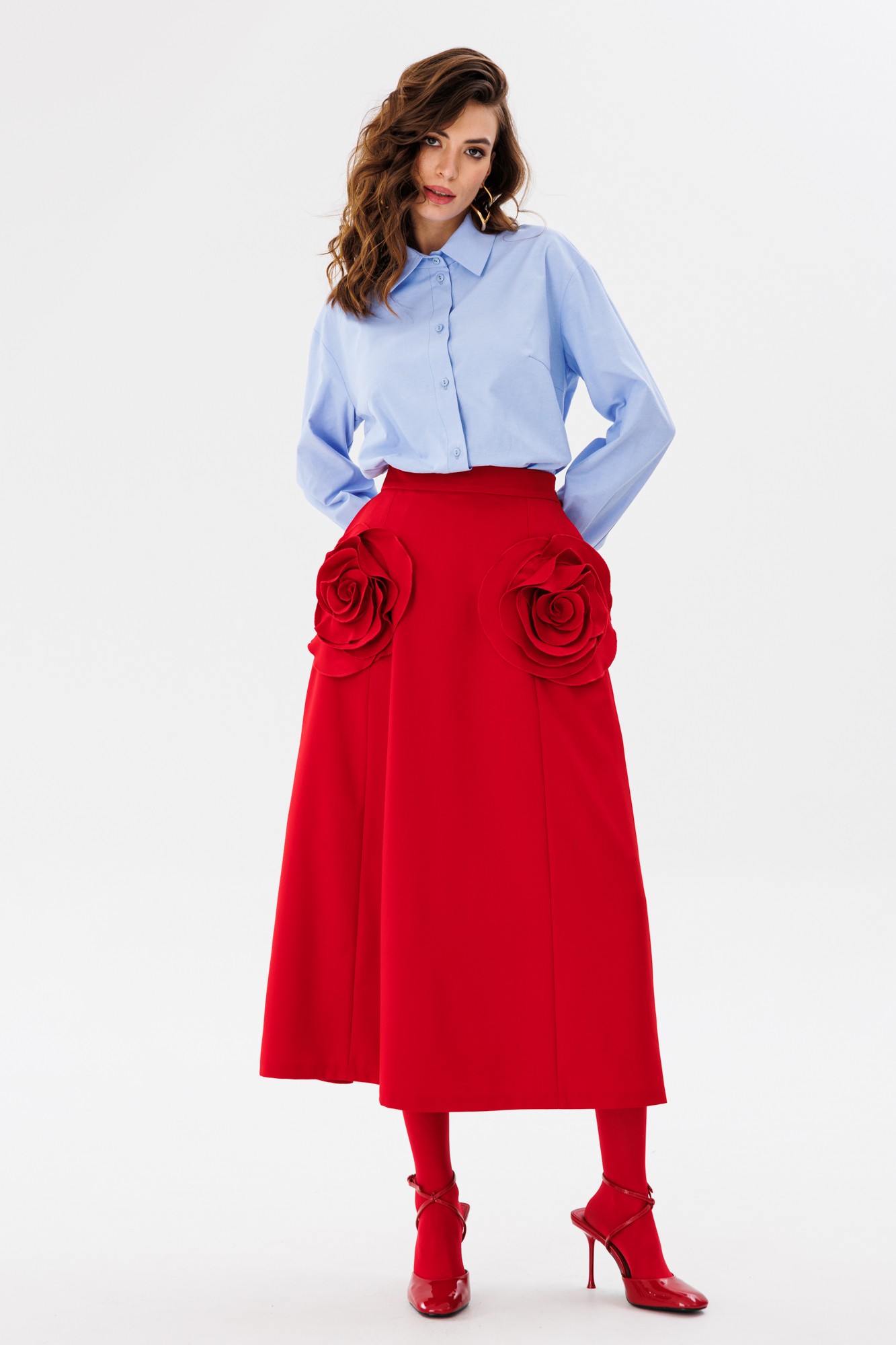 Юбка выполнена из костюмной ткани. Юбка А-образного силуэта, длиной миди. Юбка на притачном поясе. Переднее и заднее полотнище состоит из трех клиньев. Спереди карманы с наклонным входом. В левом боковом шве застежка на потайную молнию. Юбка на отлетной по низу подкладке. Юбка декорирована аппликациями в виде цветов из основной ткани.