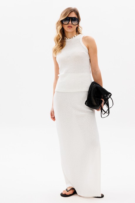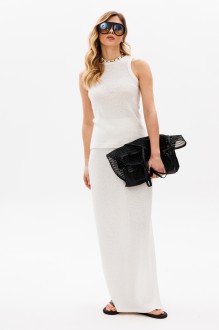 Юбка выполнена из трикотажного полотна. Юбка длиной миди, зауженная к низу. Юбка на цельнокроеном поясе с эластичной тесьмой. Переднее и заднее полотнища цельные. В левом боковом шве разрез.