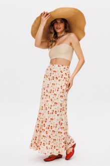 Юбка выполнена из плательной ткани с цветочным принтом. Юбка А-образного силуэта, длиной миди, на притачном поясе. Переднее и заднее полотнище выкроены по косой. В левом боковом шве застежка на потайную молнию. Пояс застегивается на пуговицу. Юбка на отлетной по низу подкладке.