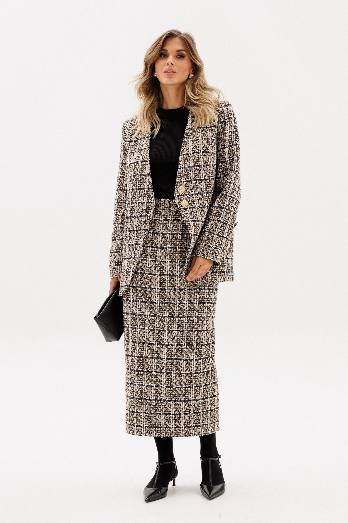 Юбка выполнена из твида. Юбка заужена к низу, длиной миди. Юбка на притачном поясе. Сзади в среднем шве разрез и застежка на потайную молнию и пуговицу. Юбка на отлетной по низу подкладке.