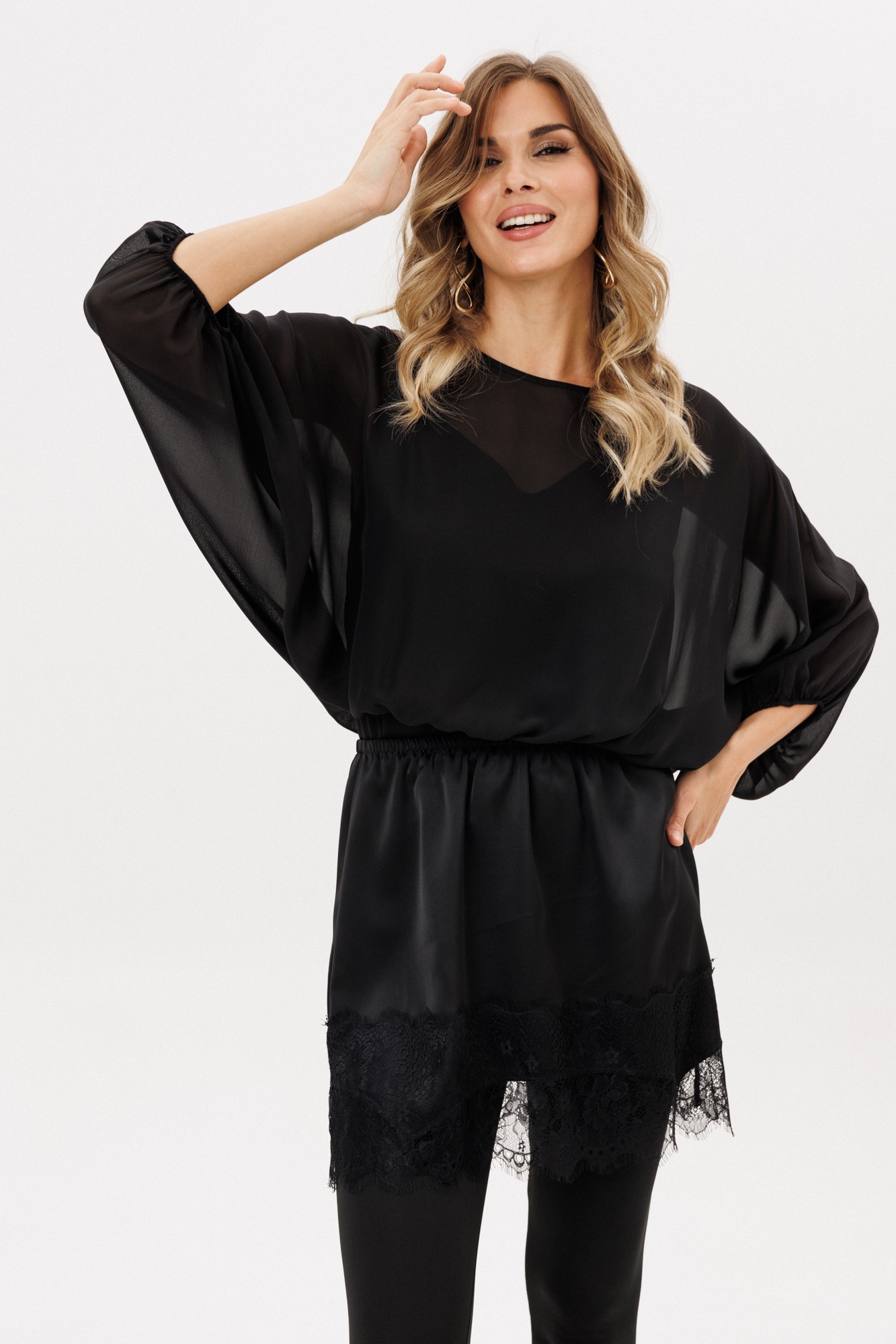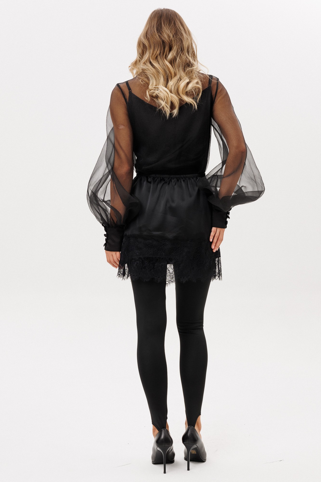 Юбка выполнена из плотного атласа. Юбка прямого силуэта длиной выше линии колена. Юбка на поясе с эластичной тесьмой. Низ фигурной формы, декорирован тесьмой-кружевом. Юбка без подкладки.