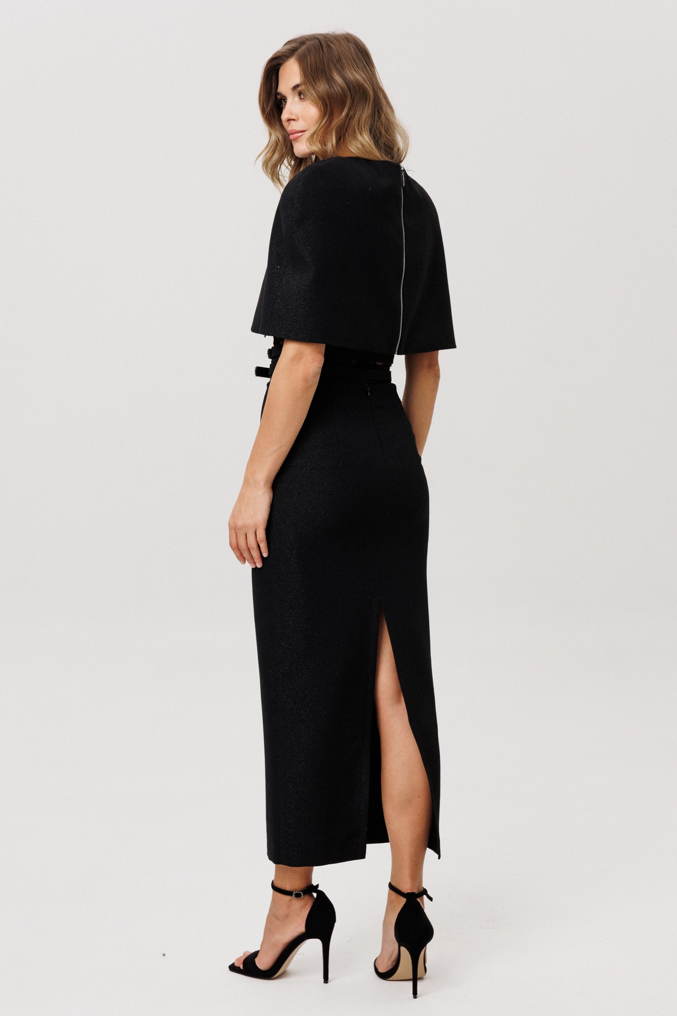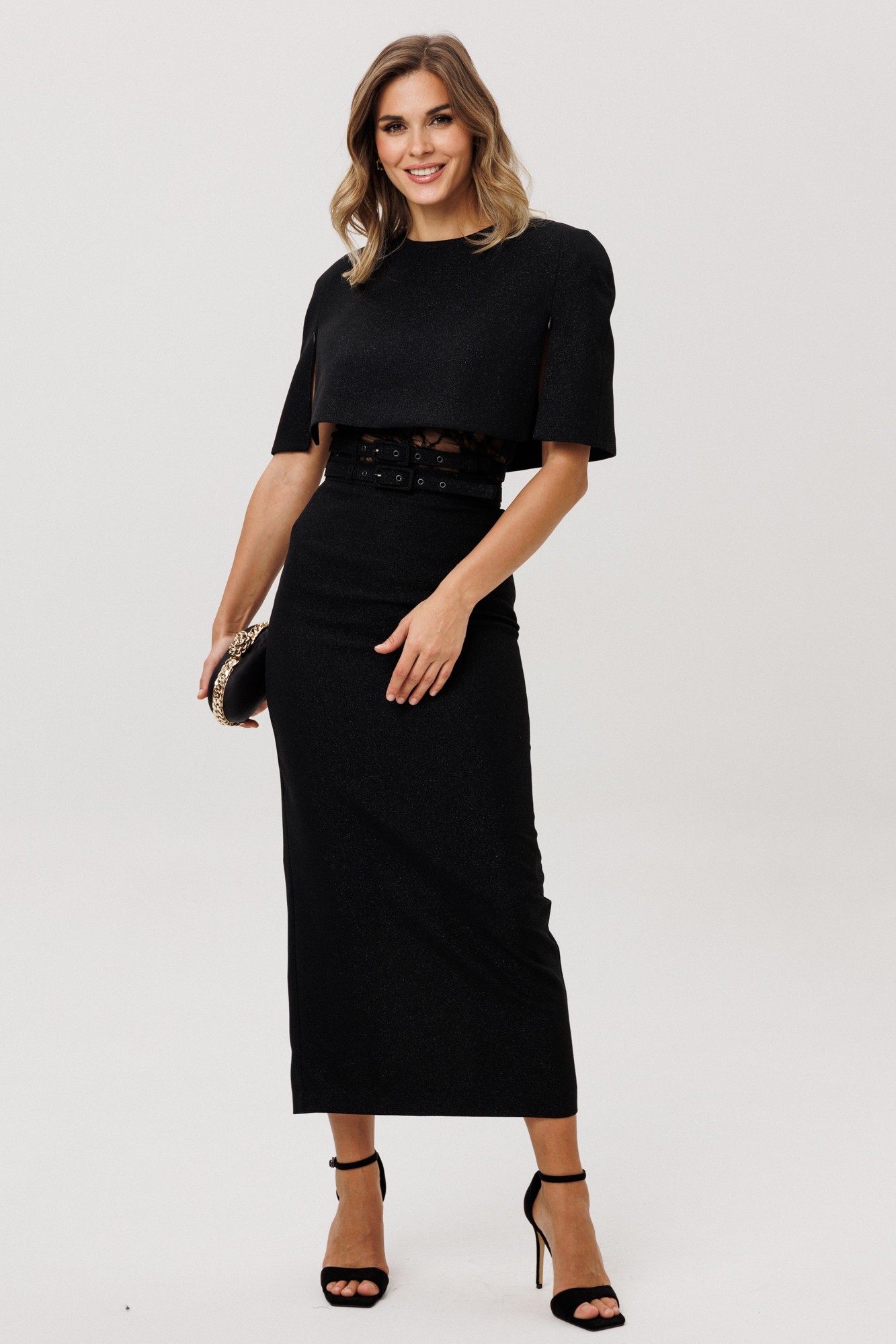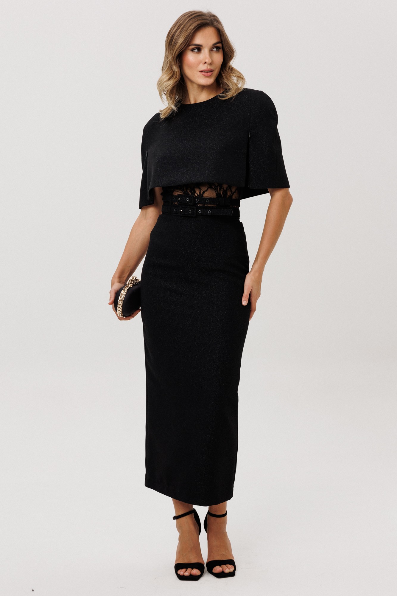 Юбка выполнена из костюмно-плательной ткани с блеском. Юбка прямого силуэта, зауженная к низу, длиной миди. Юбка на поясе, застегивающийся на петлю и пуговицу и на потайную молнию сзади в среднем шве. Юбка на отлетной по низу подкладке. В комплект входит два съемных ремня из основной ткани с обтяжной пряжкой и блочками.