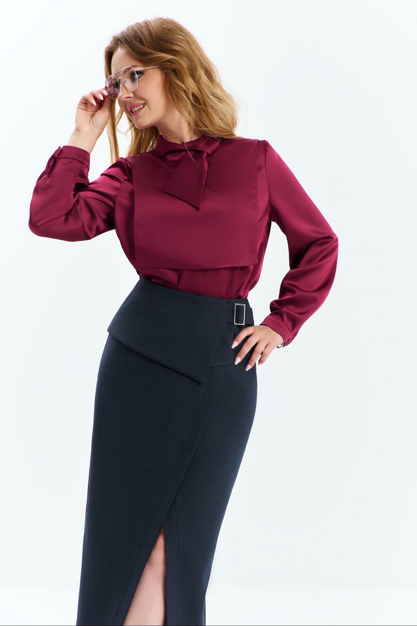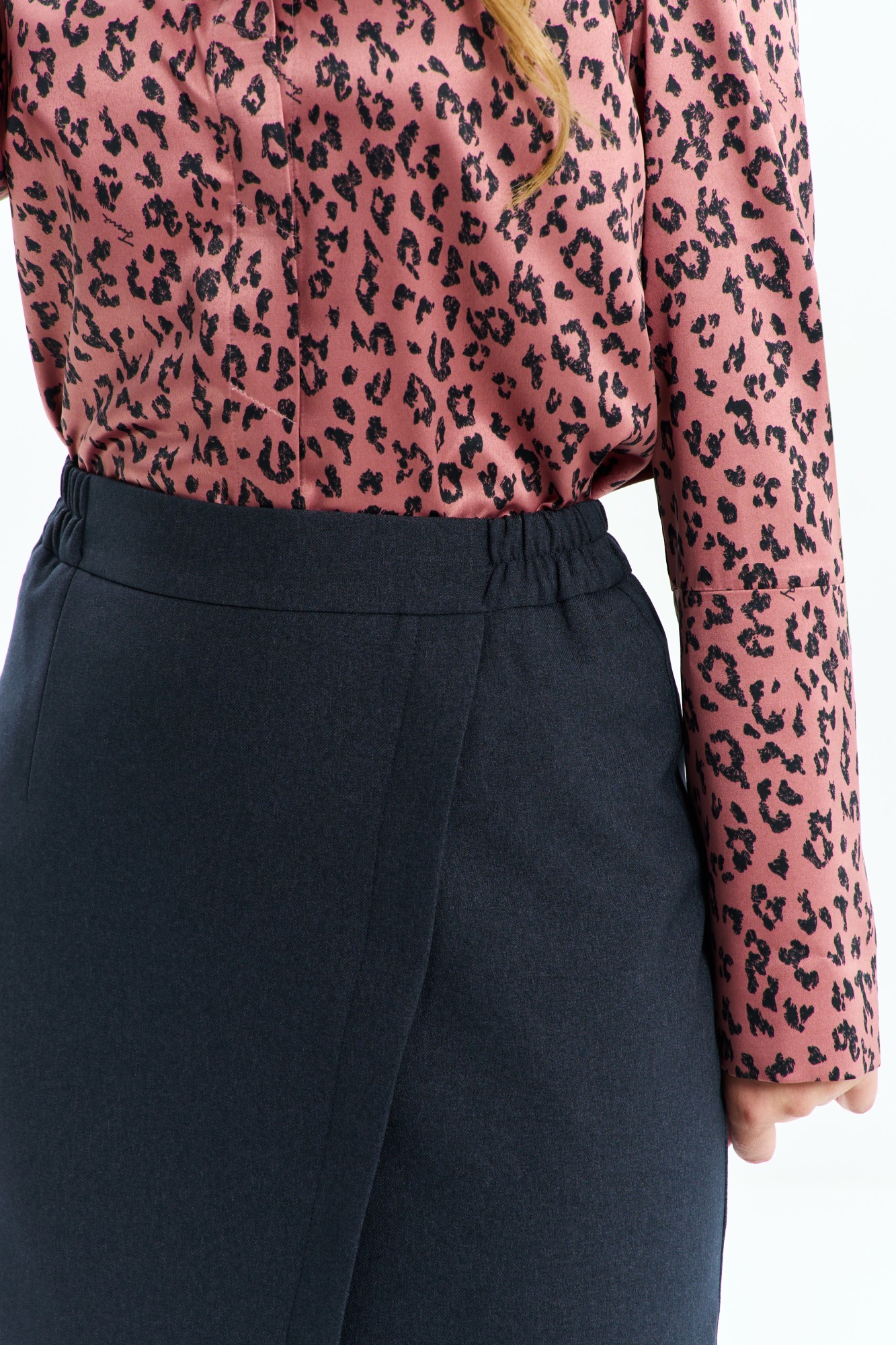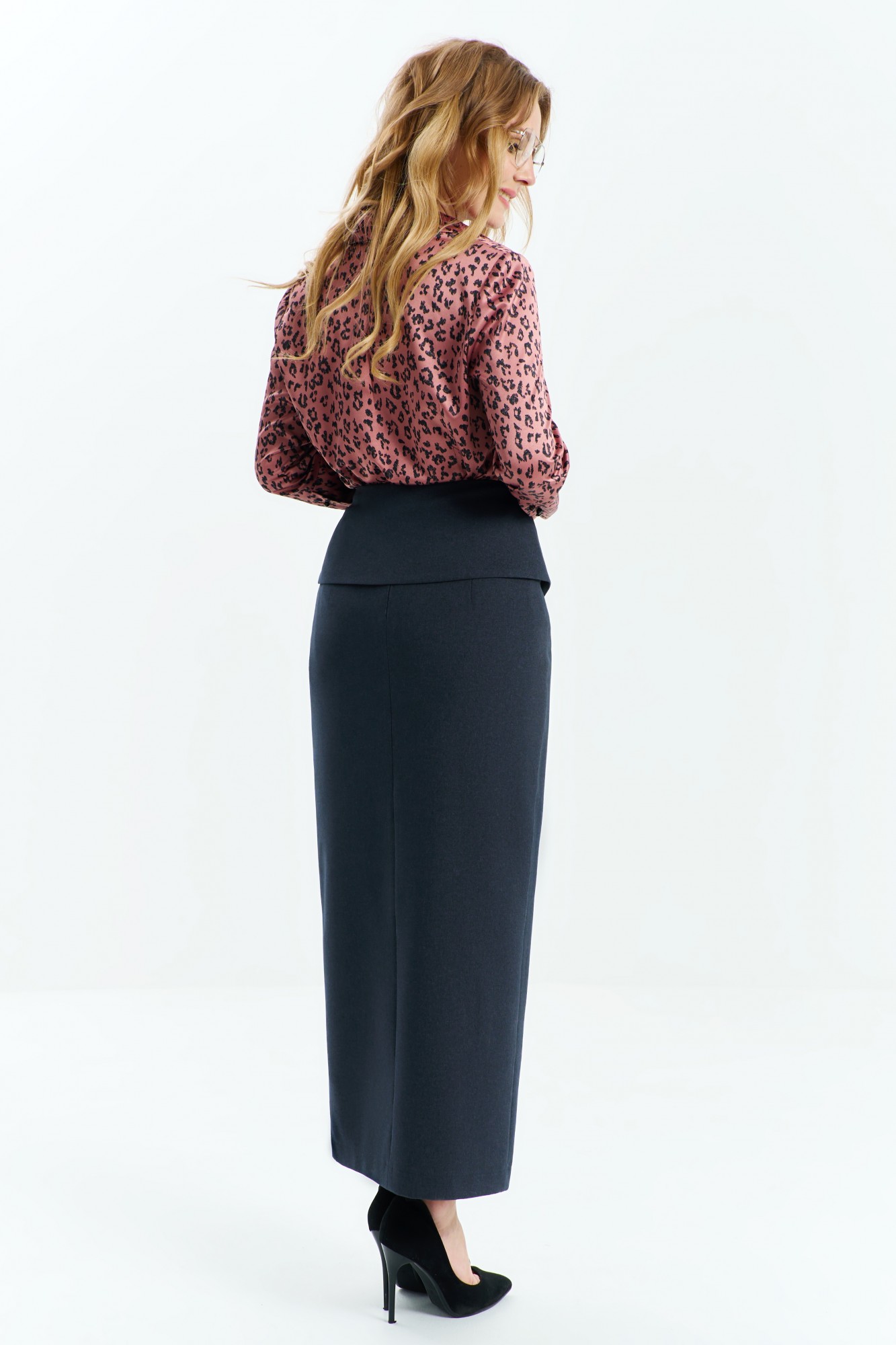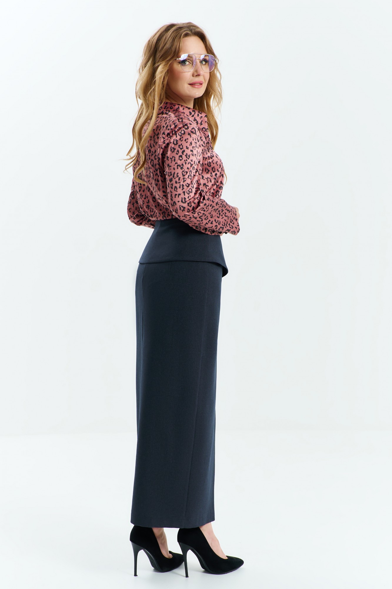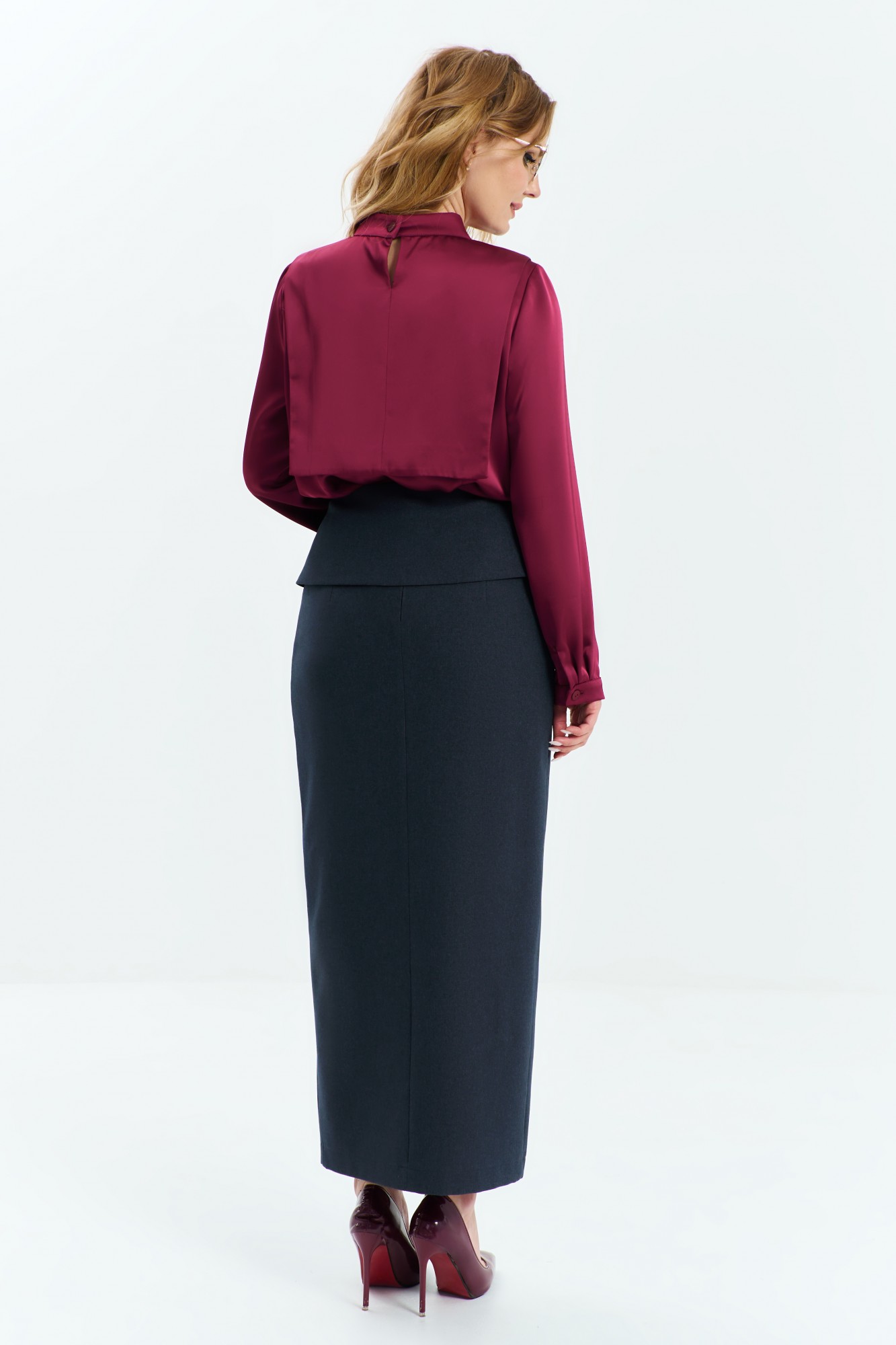 Юбка со съемной баской. Юбка длины макси (maxi), зауженная к низу . По переду юбки расположена запашная пола, и высокий разрез открывающий ногу ниже колена. Изделие на притачном поясе с резинкой в боковых швах. Застежка потайная молния в среднем шве спинки., баска съёмная, регулируется размер перетяжкой.