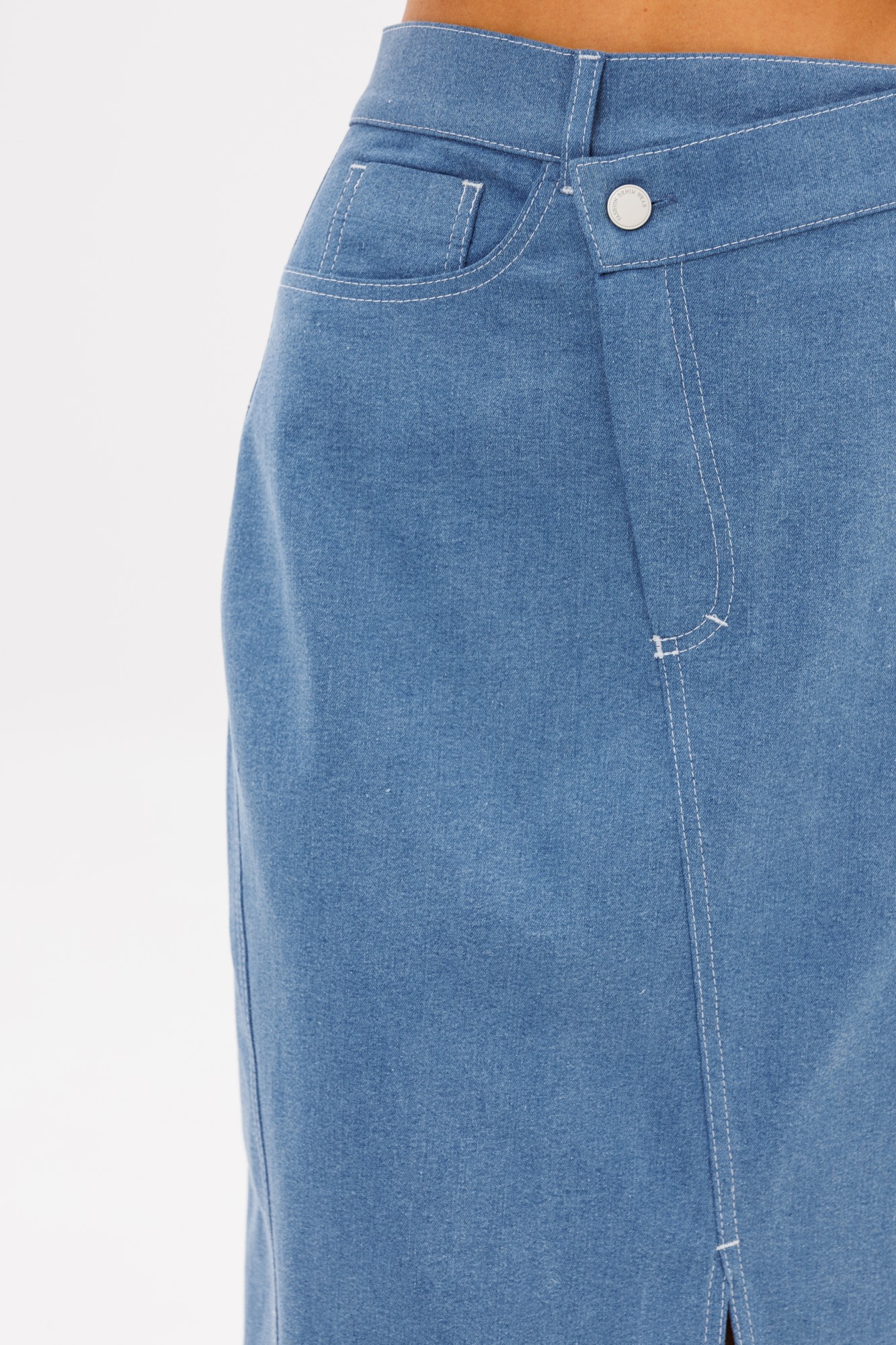 Юбка-карандаш из денима, длины миди интересного перевернутого кроя. Все швы смещенные от центра, как бы закручивают изделие, придавая ему нехарактерный образ. Модель на притачном поясе со шлевками, боковыми фигурными карманами, задними накладными карманами. По центру переда-высокий разрез.