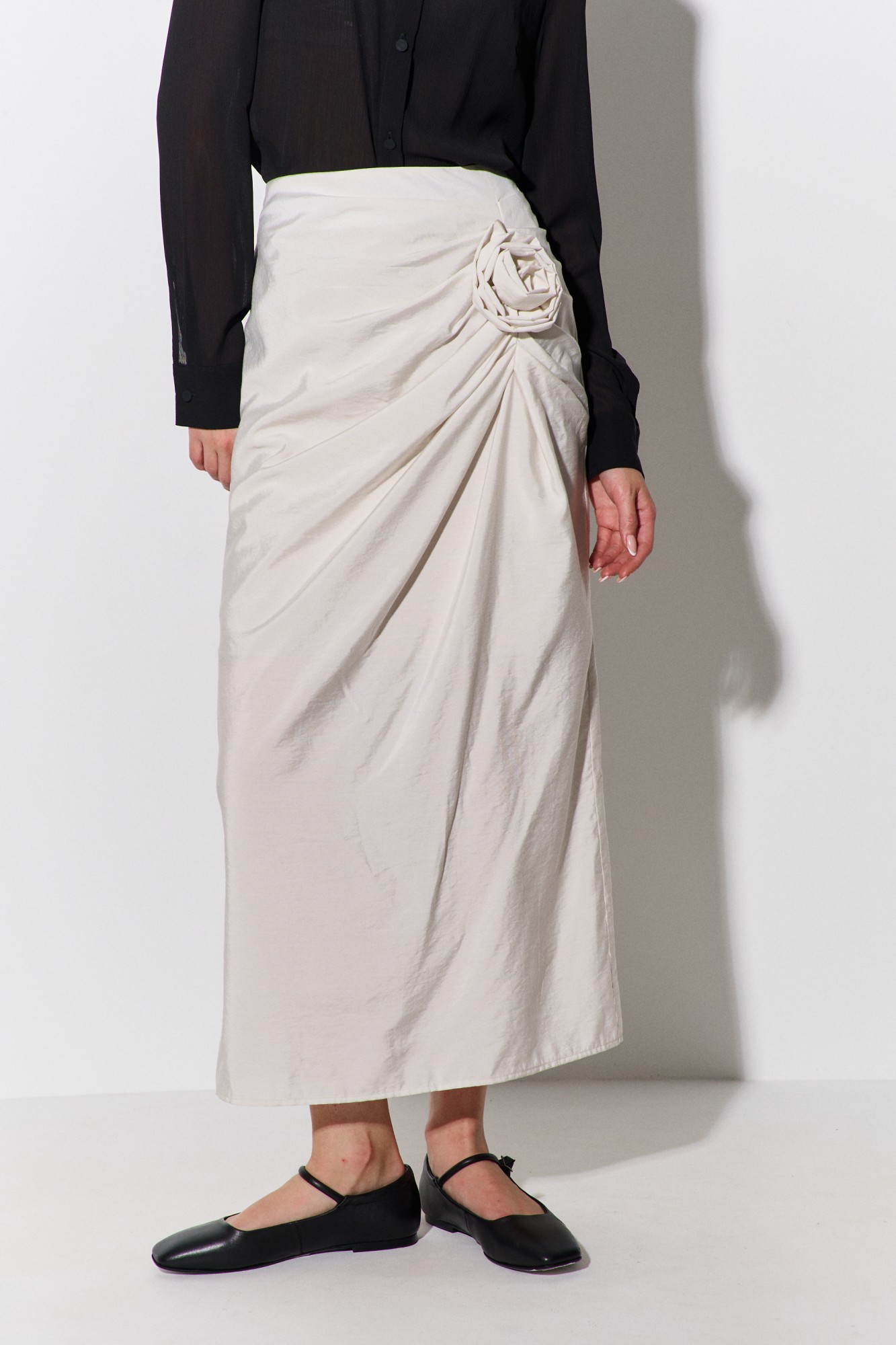 Юбка миди на подкладке прямого силуэта с декоративным элементом и цветком по переду выполнена из плательной ткани в бежевом цвете, застежка-молния по заднему полотнищу юбки, верх юбки обработан поясом-обтачкой. Длина юбки 95 см.