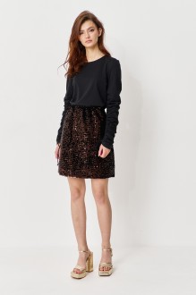 Юбка прямого силуэта в длине мини. Характеристики: выполнена из пайеточной ткани в коричневом цвете, пояс обработан эластичной тесьмой (резинкой).