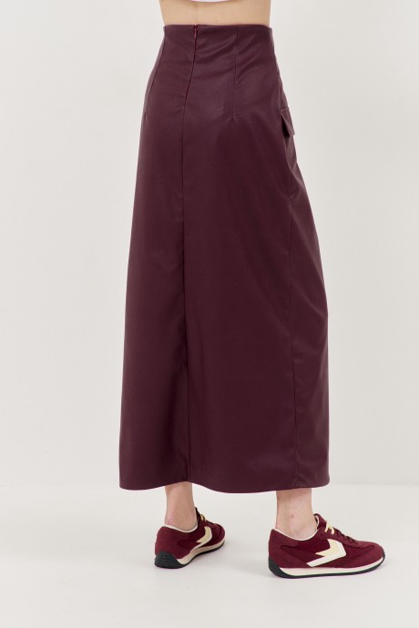 Юбка миди на подкладке прямого силуэта с фигурными подрезами по переду выполнена из искусственной кожи в цвете марсала, застежка-молния по заднему полотнищу юбки, верх юбки обработан поясом-обтачкой.