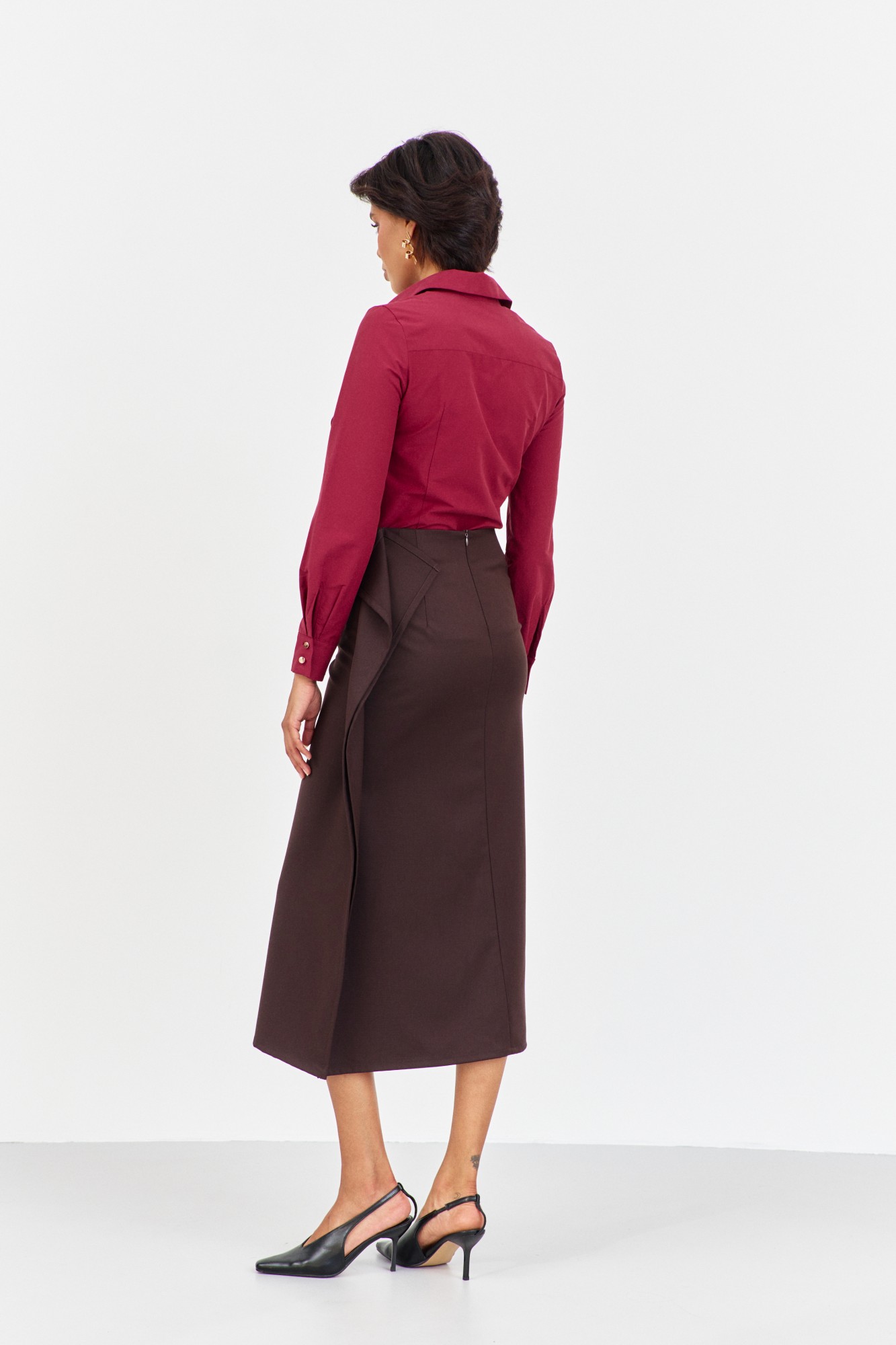 Юбка с декоративным воланом в длине миди. Характеристики: выполнена из костюмно-плательной ткани в цвете шоколад, в боковом левом шве обработан декоративный волан, застежка-молния по заднему полотнищу юбки, верх юбки обработан поясом-обтачкой.
