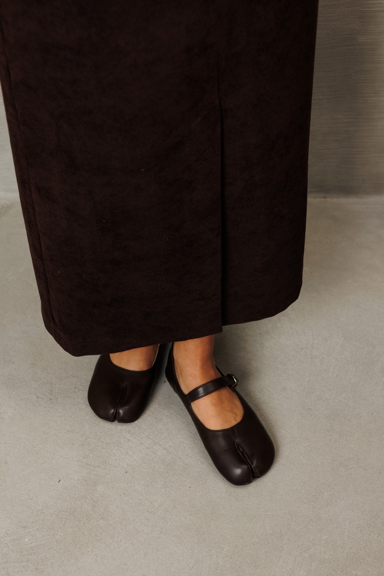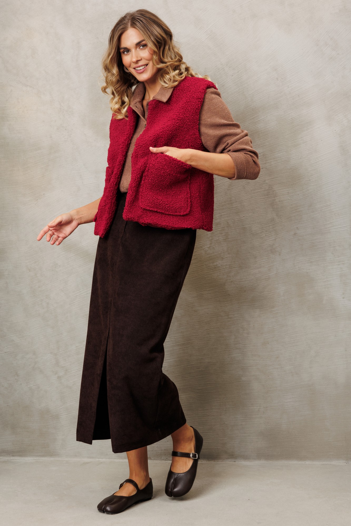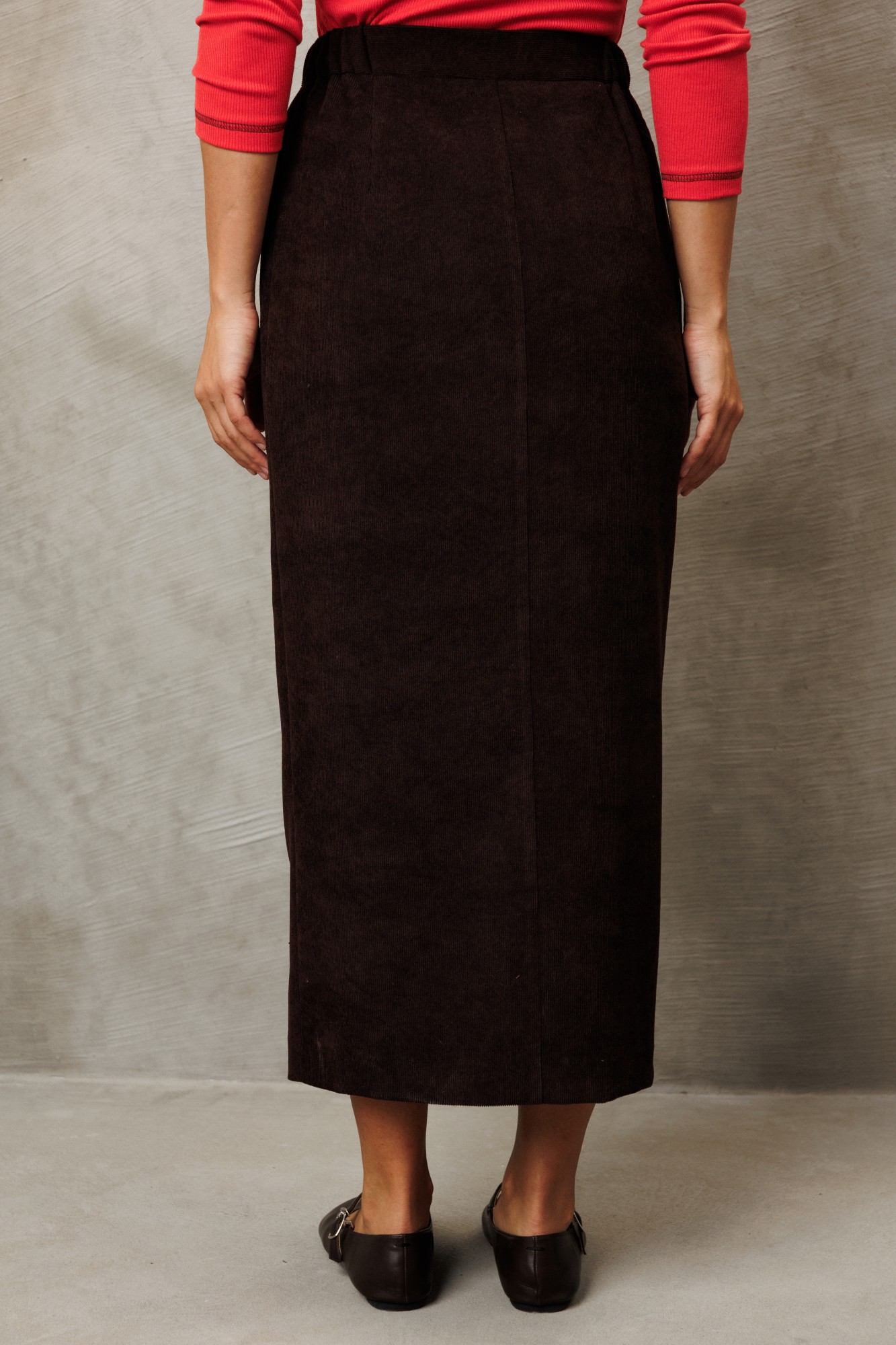 Юбка прямого силуэта выполненная из мягкой вельветовой ткани. Передняя честь юбки с вытачками, со средним швом и застежкой гульфиком на молнии и щпицей спереди. Задняя часть юбки с вытачками. Юбка на притачном поясе с застёжкой на петлю и пуговицу спереди и резинками по бокам. Юбка на подкладке.