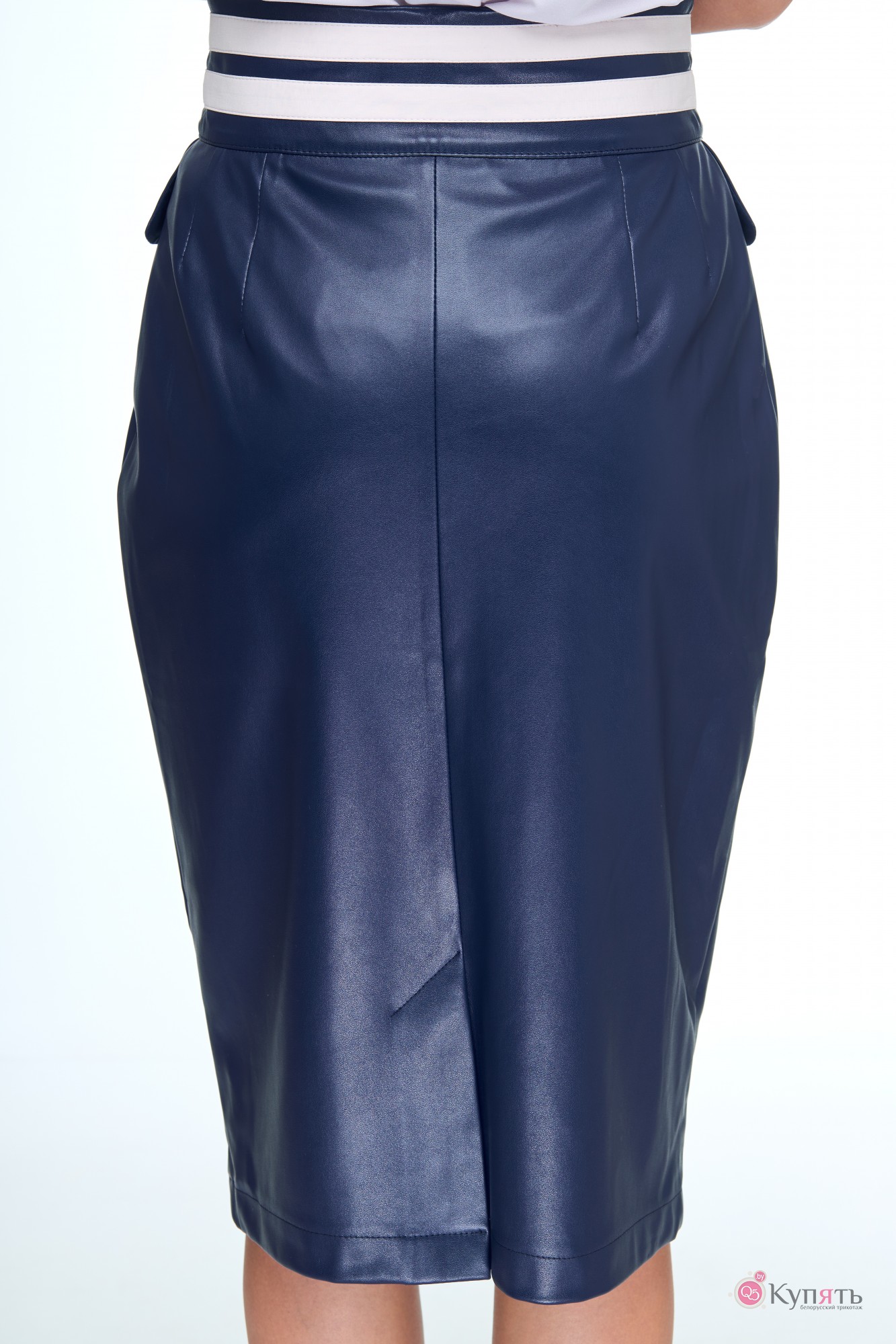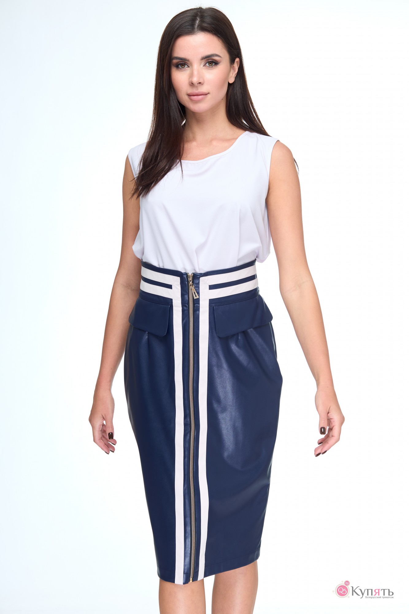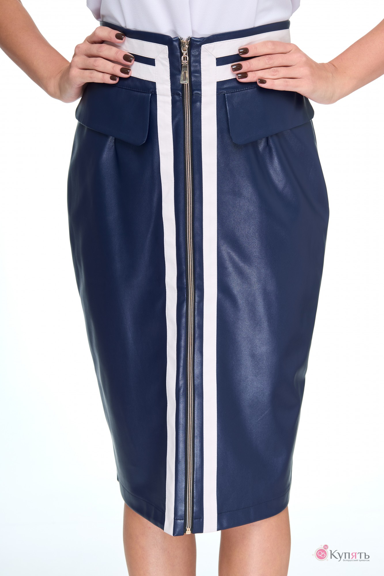Прямой силуэт, притачной пояс с элементами отделки. Застёжка по переду по всей длине юбки на металлической разъемной молнии.